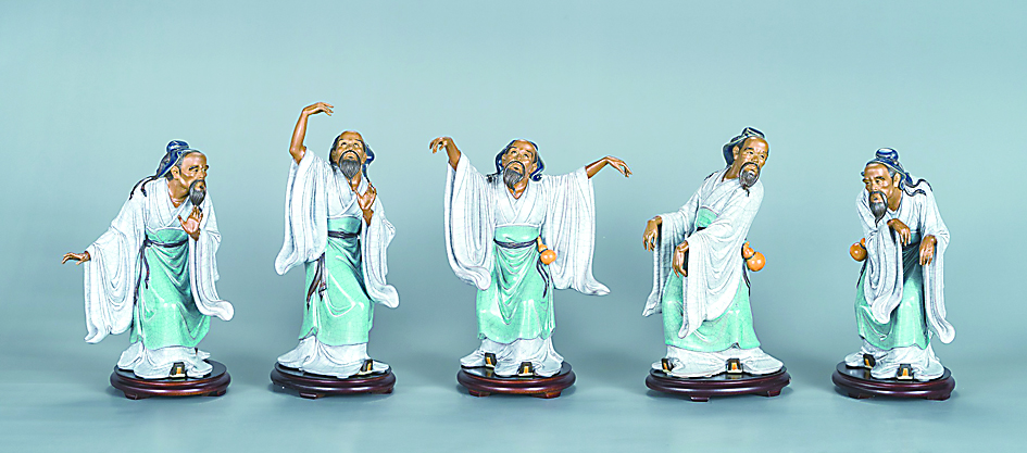 刘炳多年来对石湾传统陶艺进行钻研学习,同时吸收不同的艺术营养,逐步形成自己的艺术特色。五禽戏是一种中国传统养生的功法,即通过模仿虎、鹿、熊、猿、鸟(鹤)五种动物的动作,以达到呼吸运动与肢体运动相结合的一种保健强身的气功功法。是中国古代医家华佗在前人的基础上创造的,故又称“华佗五禽戏”。陶塑《五禽戏》,以华佗为原型分别模仿虎戏、鹿戏、熊戏、猿戏和鸟戏。“虎戏”,目光炯炯,摇头摆尾,扑按,表现出威猛神态。“鹿戏”,如鹿样心静体松,姿态舒展,表现其探身,仰脖,奔跑,回首之神态。“熊戏”,如熊样浑厚沉稳,表现出撼运,以步行时之神态,笨重中寓轻灵。“猿戏”,仿其猿步势,表现其敏捷好动。“鸟戏”,仿其昂然挺拔,悠然自得,表现出亮翅、轻翔之神态。造型生动传神,风姿秀逸。