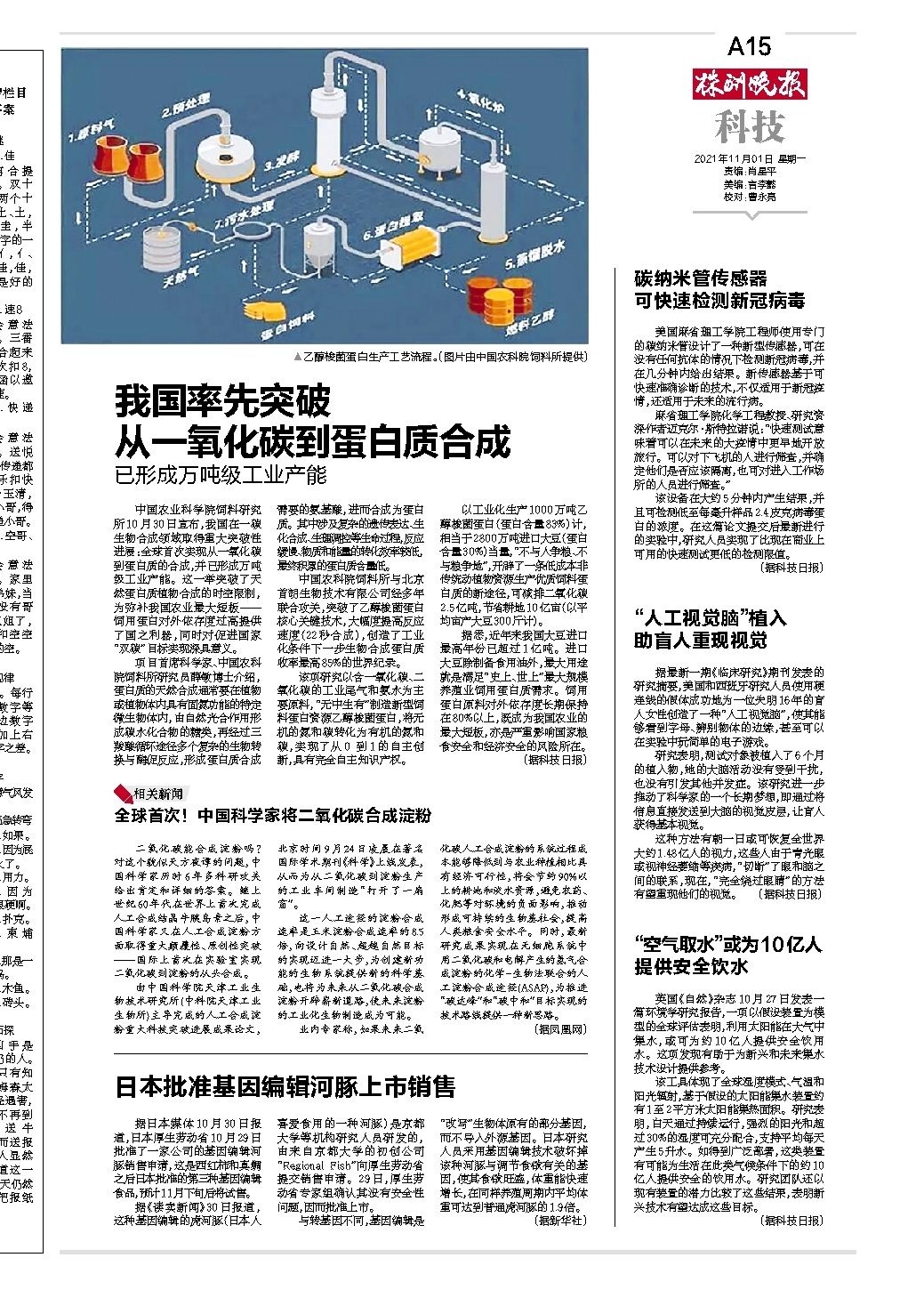 我国率先突破 从一氧化碳到蛋白质合成