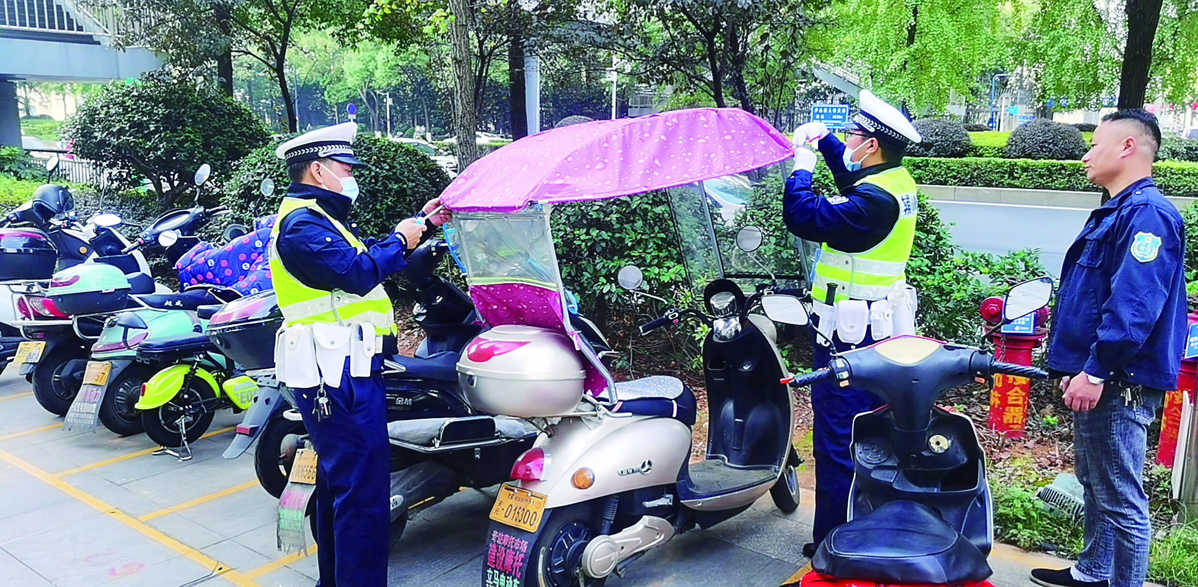 ▲天气渐冷,我市持续推进“戴帽工程”专项行动,对未戴头盔的摩电驾乘人员予以处罚,对非法安装的遮阳伞进行拆除。目前,全市摩电骑乘人员安全头盔佩戴率已达80%,摩电上牌率也有75%。图为交警现场拆除电动自行车遮阳伞。 (文/记者 沈全华 通讯员 彭晚华 付强 图/市公安局交警支队)