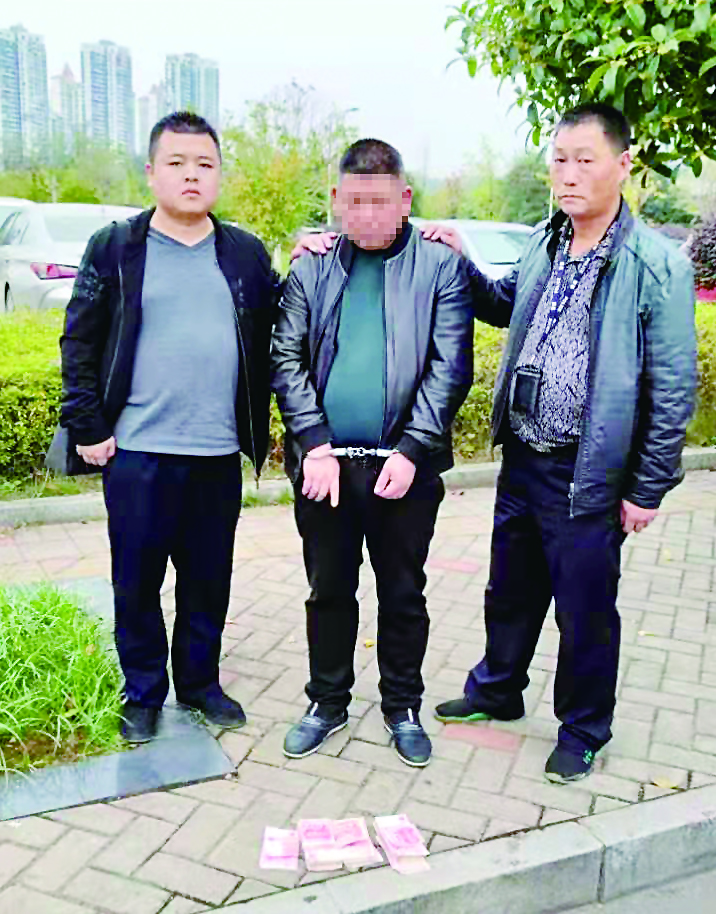 ▲落网的袁某(中)指认盗走的现金及作案现场。通讯员供图