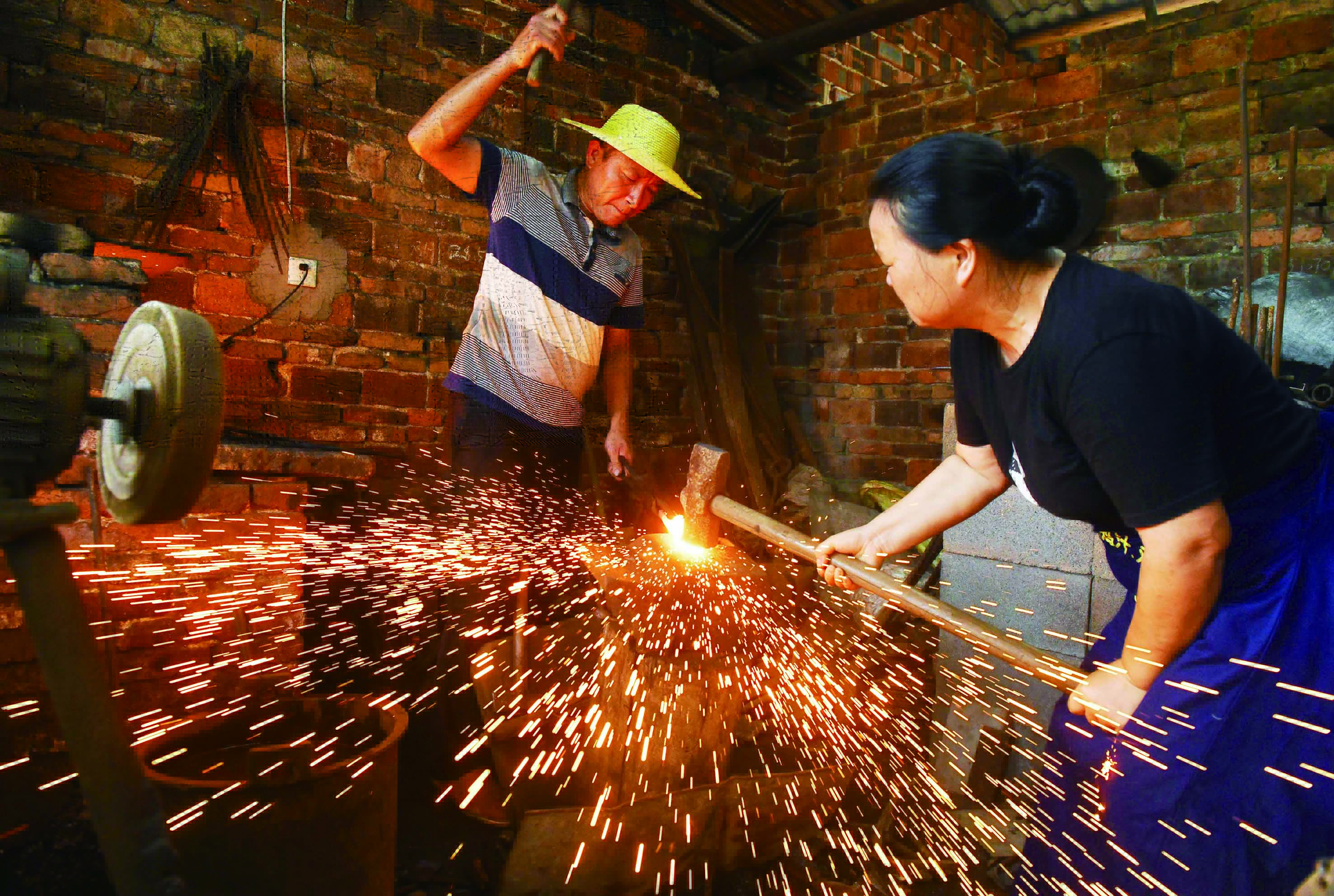 48岁的凌玉清和妻子,大锤、小锤轮番上阵,他们正在打造一把定制的草刀。