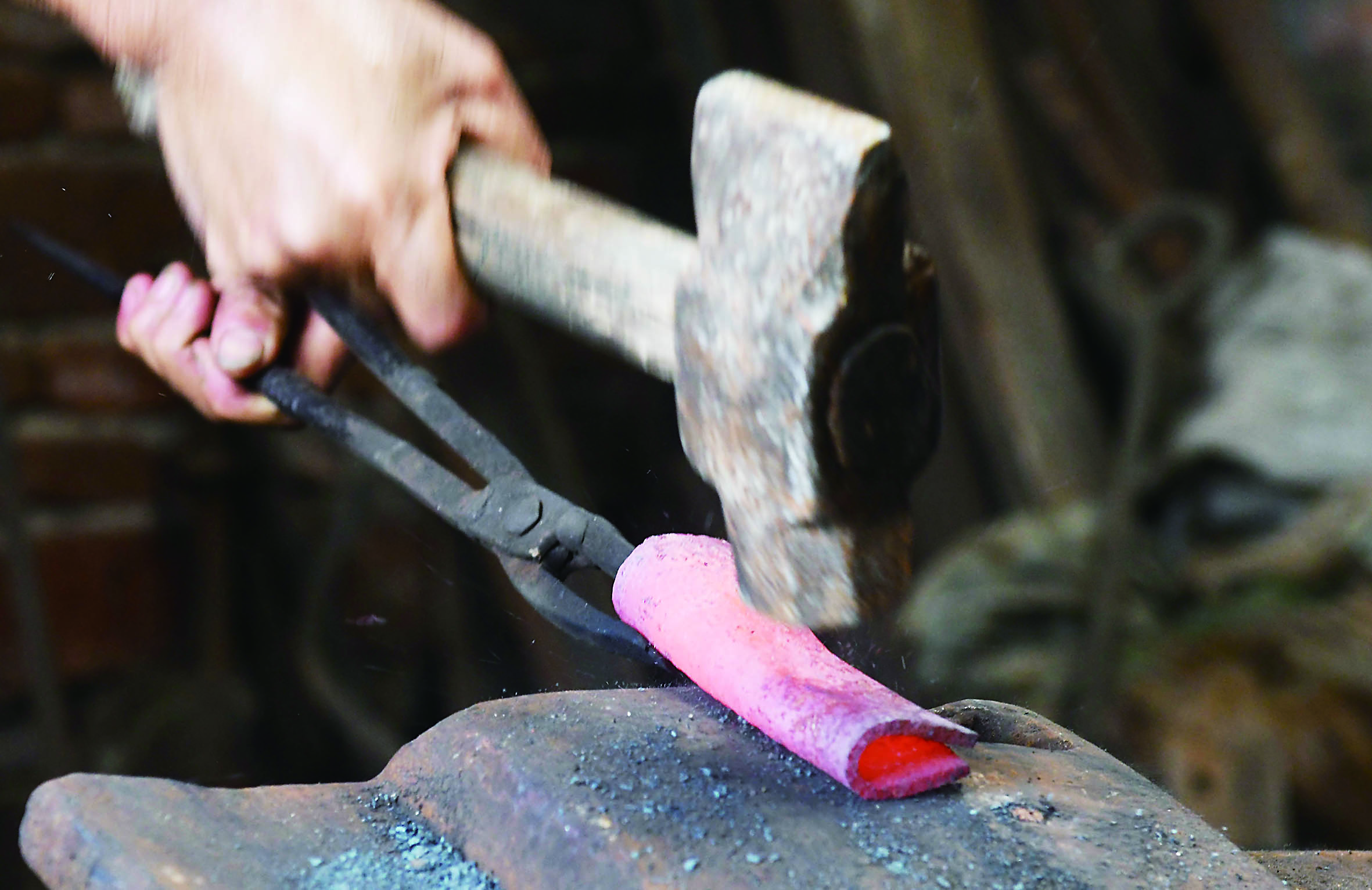 ▲铁料出炉时锻打的头几锤,火花四射。