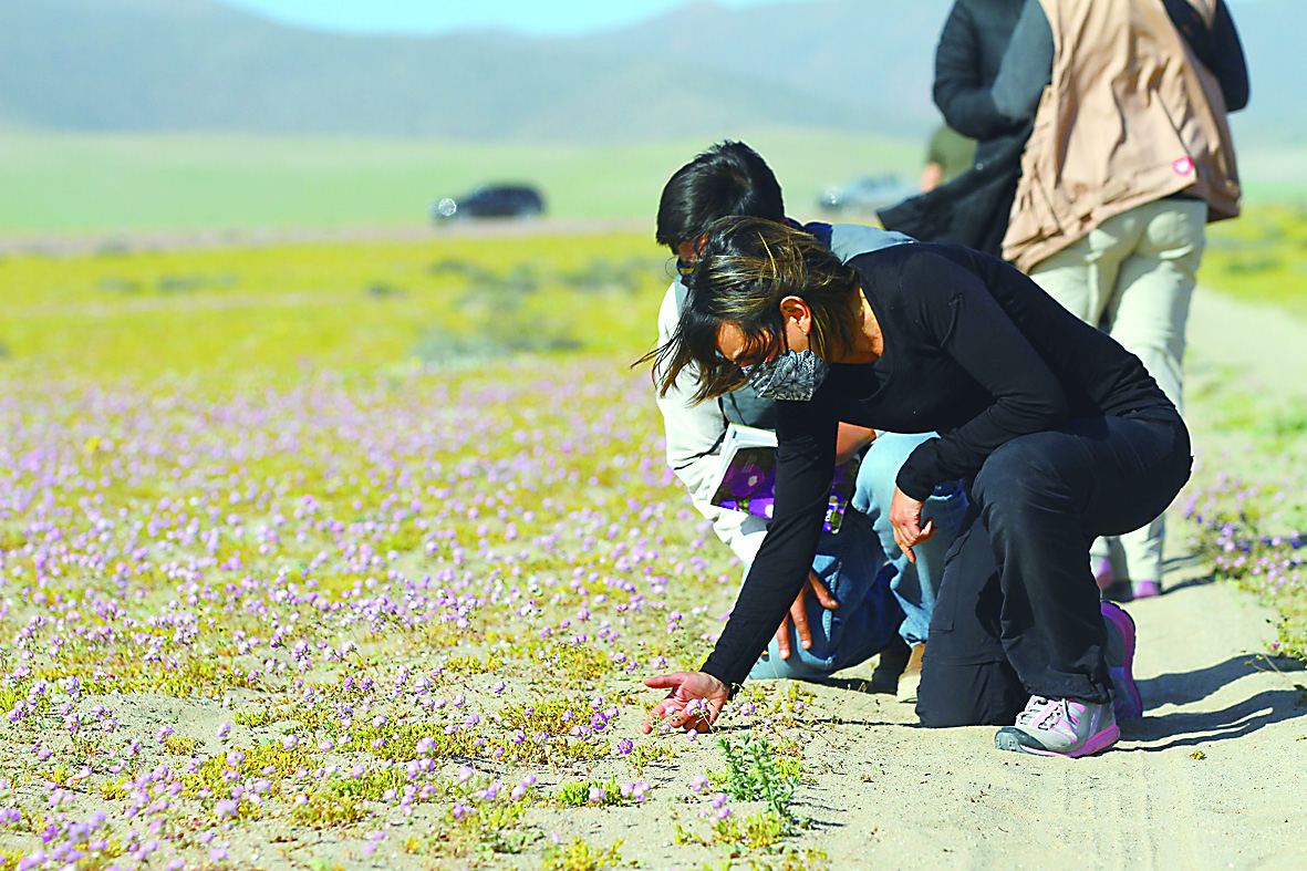 10月13日,在智利北部的阿塔卡马沙漠,游人欣赏沙漠中开花的美景。 今年6月至8月阿塔卡马沙漠南缘经历了几场降水,春季到来时,这里便绽放出大片的花毯。“开花的沙漠”这一现象作为智利北部春季偶有出现的美景,吸引了各地的旅游者,也为当地科学家研究耐旱植物特性、利用基因技术发展耐旱作物提供了“天然实验室”。