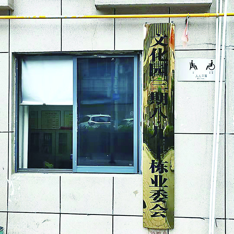 ▲小区挂出第二块“业委会牌子”,老物业公司继续营业。 记者/王晖 摄
