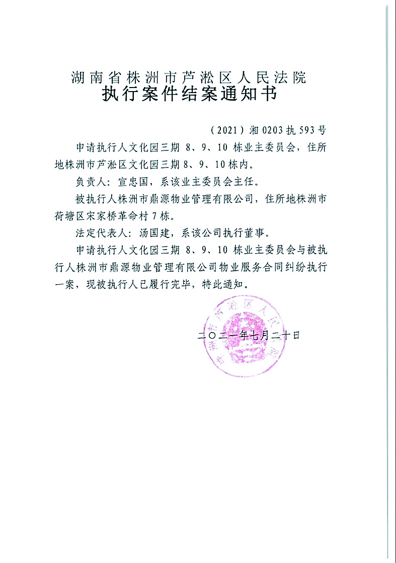本报讯(株洲晚报融媒体记者/王晖)今年3月,芦淞区法院下了强制执行书,要求被告株洲鼎源物业管理公司(以下简称鼎源物业)在公告十日内撤出文化园三期小区。到了11月,鼎源物业公司还牢牢占据着小区。芦淞区法院执行局却给原告下了案件执行完结通知书。