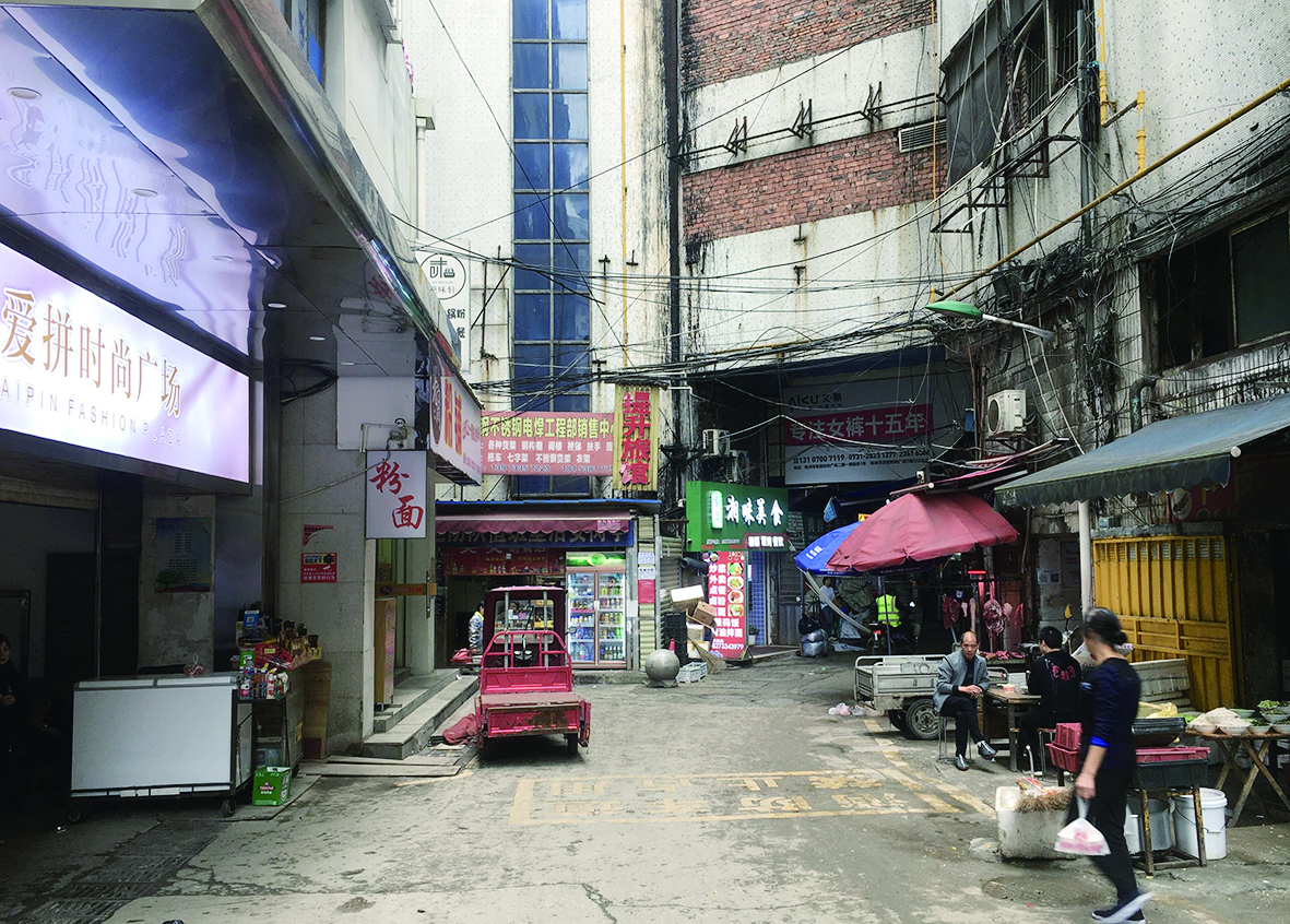 消防通道位于爱拼时尚广场与其他服装市场之间,通道地面标注有“禁止占用消防通道”提示。通道上方横跨有不少电缆线,将爱拼时尚广场与相邻服装市场相连。