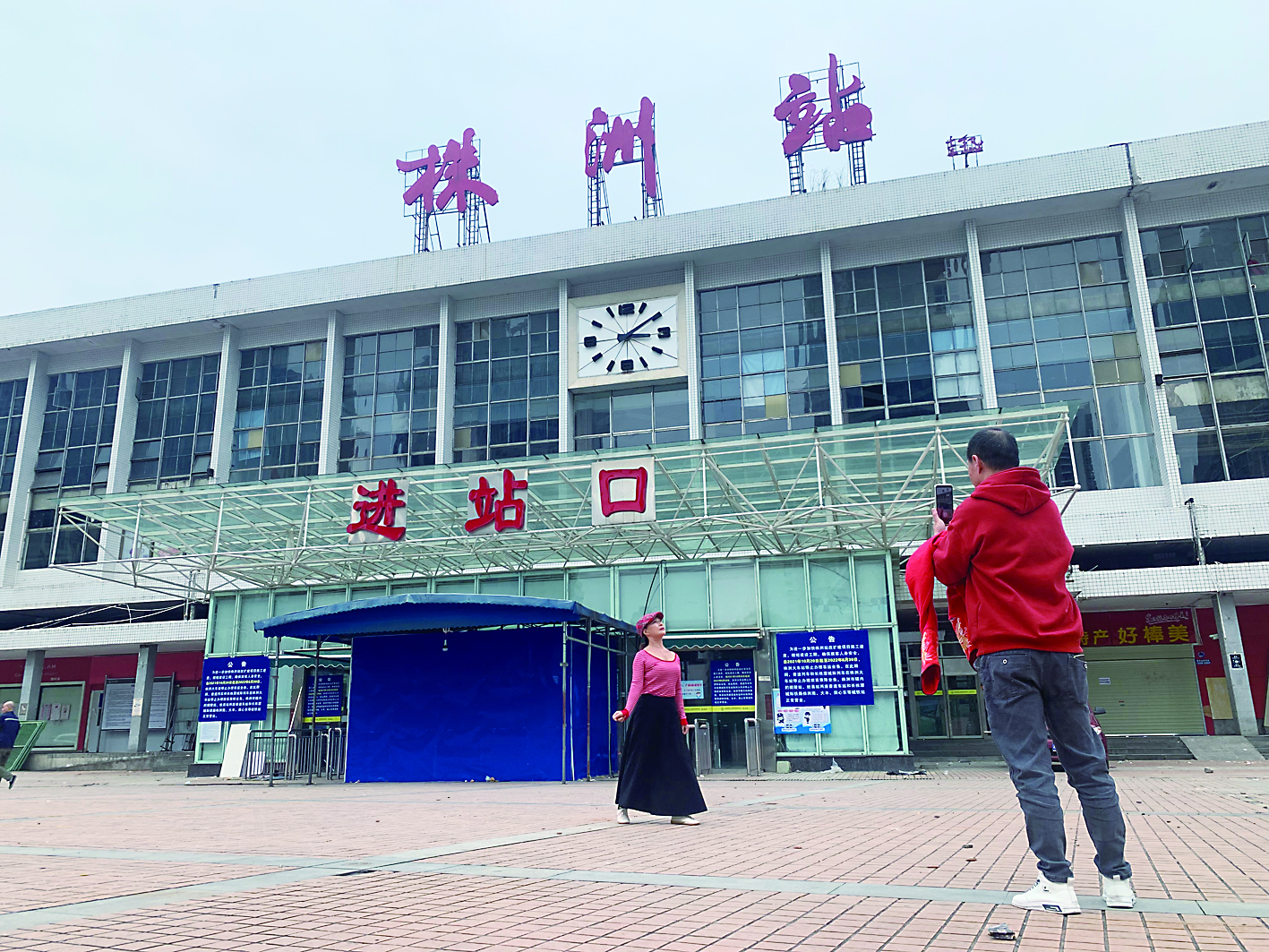 火车站进站口处,一位女士正在录制短视频。她提醒拍摄者对准“株洲站”三个红色大字,然后她翩翩起舞,又多次调整,努力找到最佳状态。