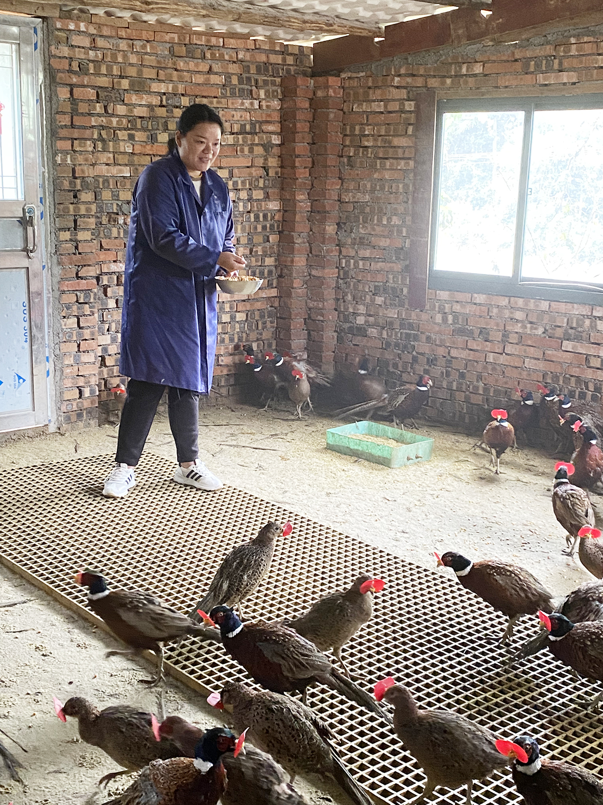▲刘慧在喂七彩山鸡。记者/旷昆红 摄