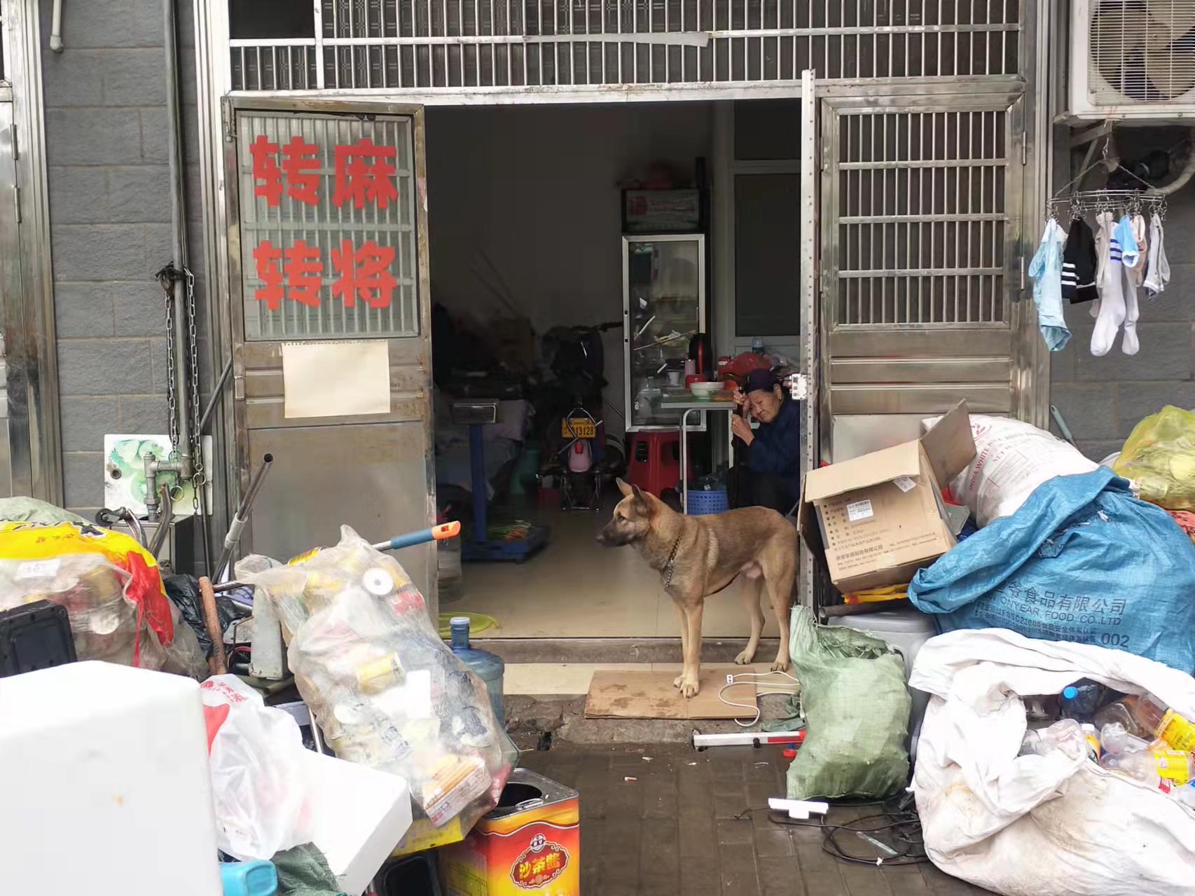 养犬门店经营废品收购业务,店外人行道上堆放着很多废品,其中不乏尖锐的金属条、金属格栅,路人从店门口经过,要么绕路到主干道,要么只能从废品堆中穿行而过。
