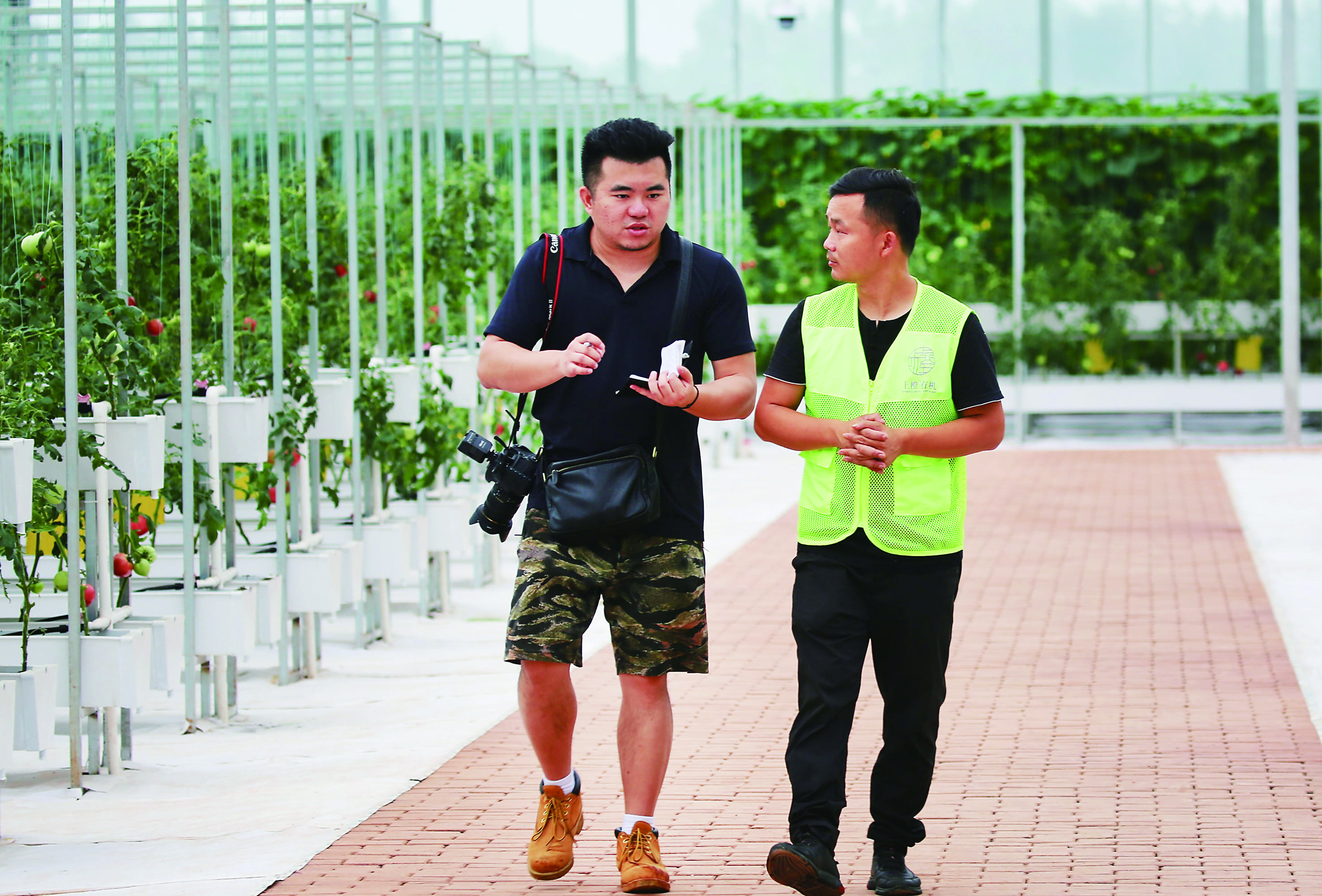 ◀2021年6月20日,民生新闻部记者马文章(左)在天元区三门镇上橙有机农业基地采访。