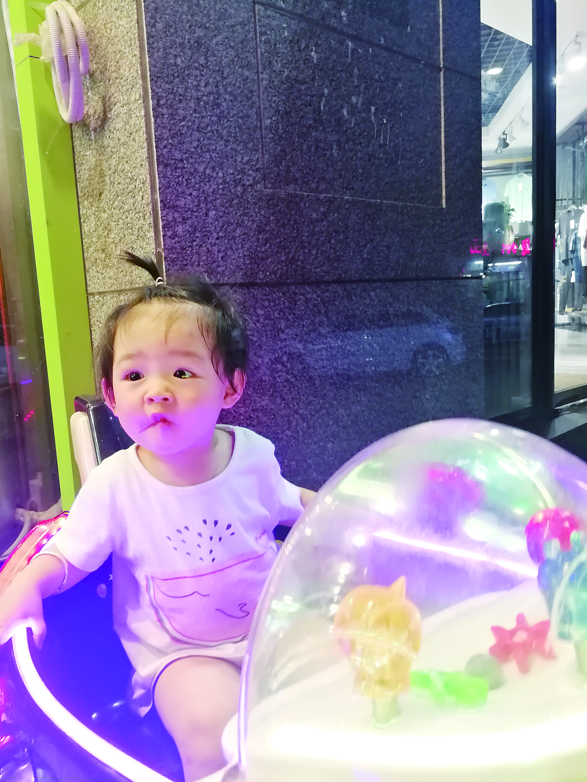 那天晚上天气很热,我和妻子如同往常一样,吃过晚饭后带着biubiu出门散步,不知不觉中又来到了母婴店门口。五彩灯光闪烁、音乐旋律流转,biubiu盯着摇摇车不肯离开。我和妻子一商量,决定让她去坐一坐自己的最爱。投入一元硬币后,摇摇车缓缓摇起来,扎着“小天线”,撅着小嘴巴的biubiu坐在车里十分高兴,笑个不停。趁着她看向妈妈的时候,我用手机拍下了这张照片,记录下这个快乐的瞬间。