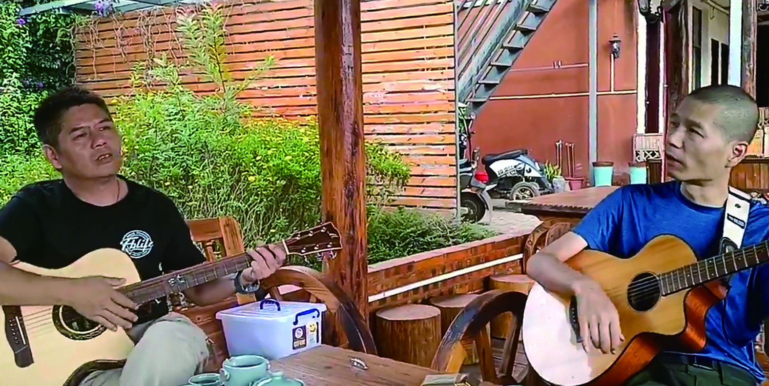 ▲西双版纳的慢生活,贺湘闽(左)和梁成在弹吉他。受访者供图
