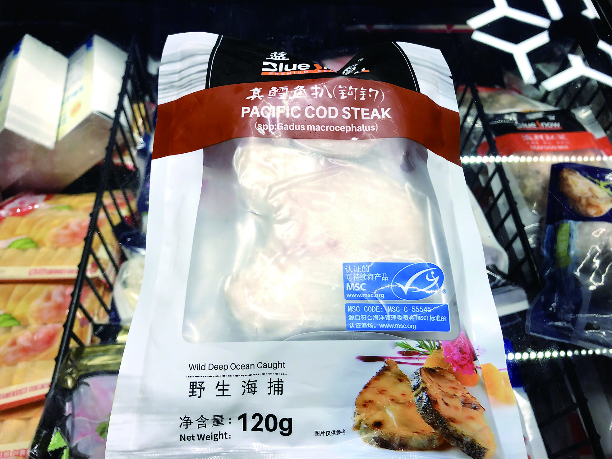 ▲胡女士在苏宁广场家乐福超市中购买的鳕鱼产品。记者/易楚曈 摄
