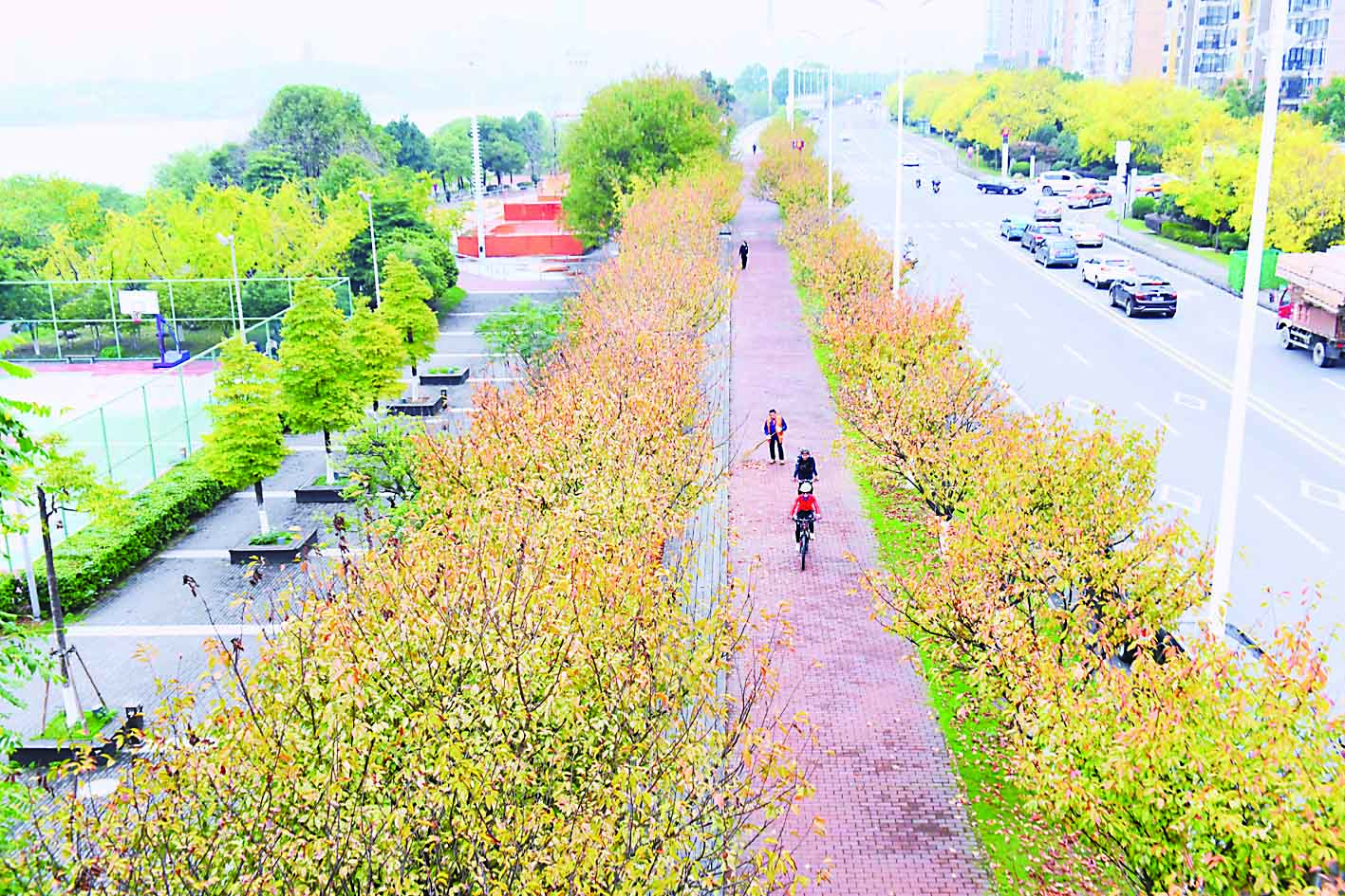 河西滨江路五桥段,金黄色的樱花树也把最美的姿态展现出来,一片片黄色的叶子随风飘落,给大地铺上一块金黄的地毯。一些市民骑着自行车有意往这里穿过,就是想体验一下那种人在画中游的感觉。