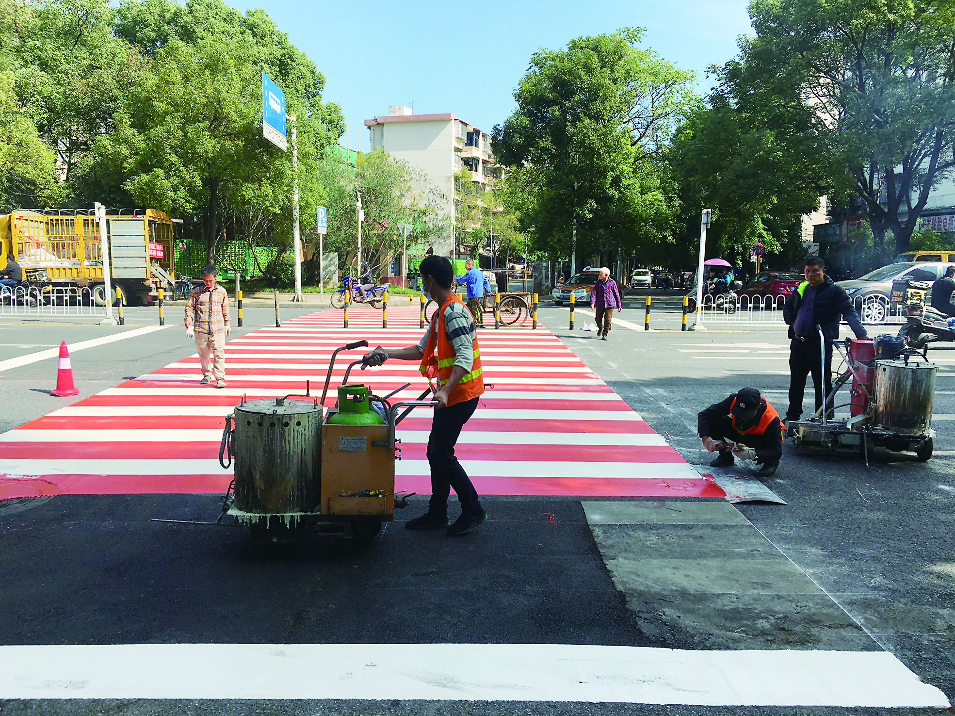 本报讯(株洲晚报融媒体记者/刘平)11月9日,天元区牛形山路与黄河南路交叉路口,施工人员将斑马线刷成红白相间的颜色,非常亮丽显眼。
