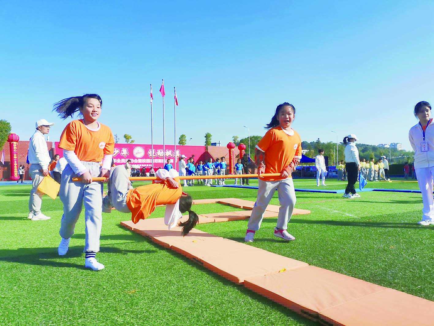 ▲高年级的同学参加“抬小猪”趣味赛。记者/戴凛 摄