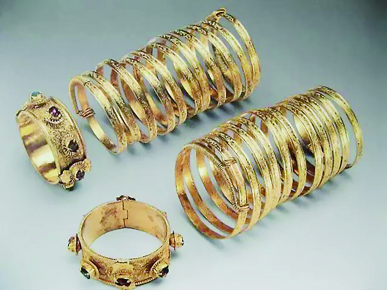 ▲金钑花钏暨金镶宝石镯,梁王妃魏氏陪葬饰品。(图片来源网络)