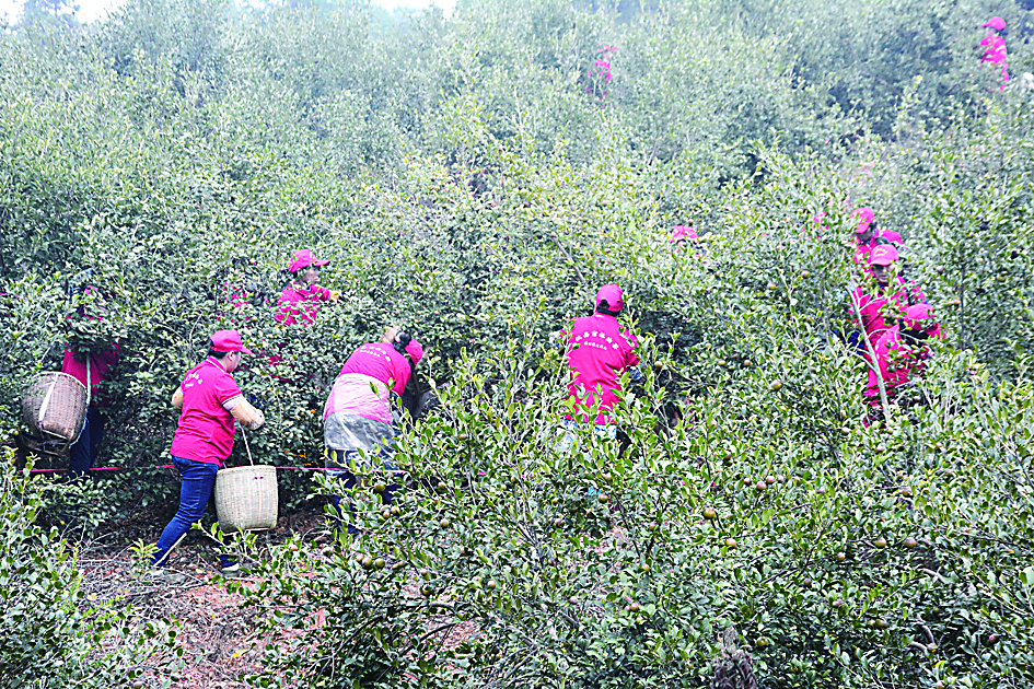 ▲茶农们抢抓时间采摘油茶果。通讯员供图