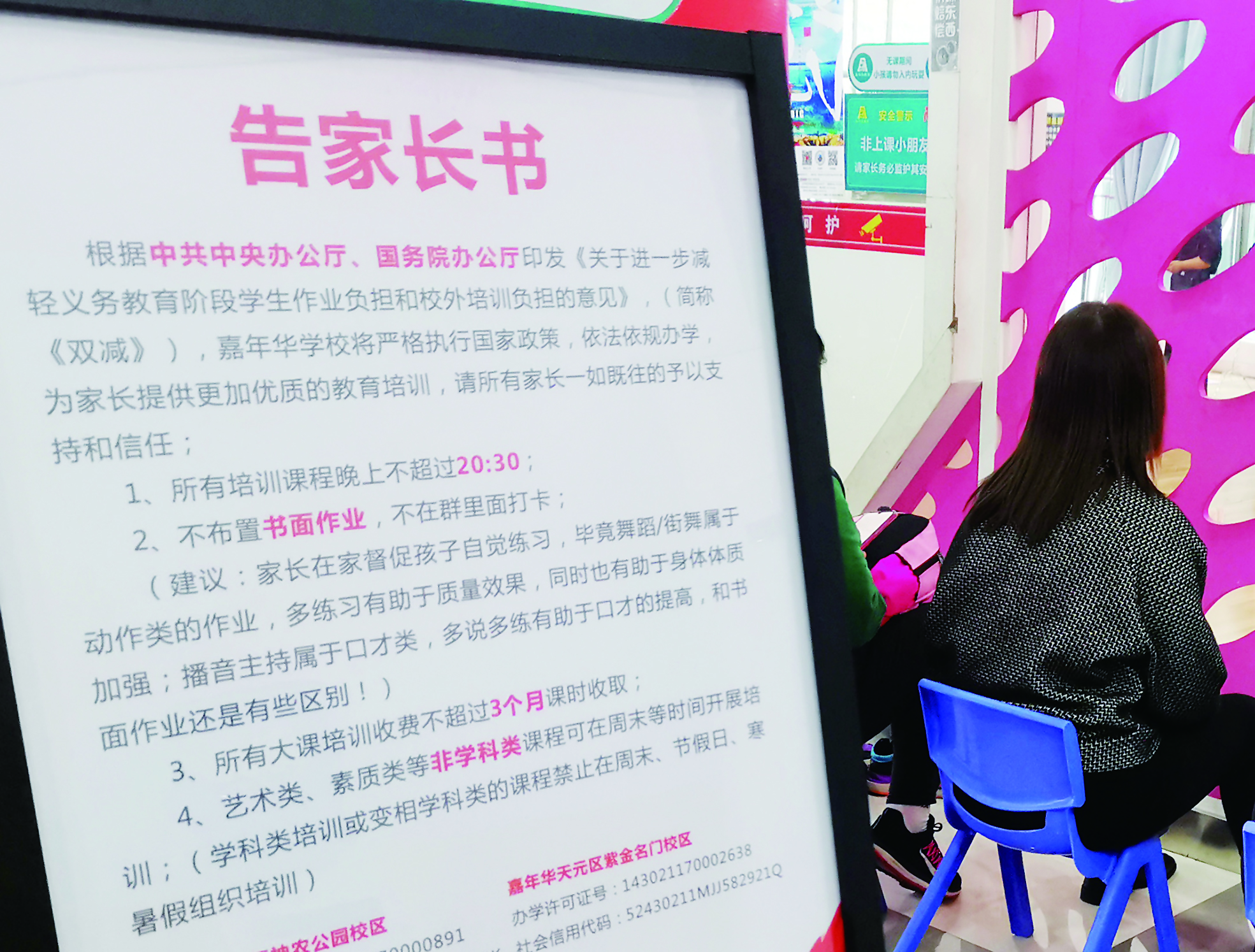 ▲不少培训机构都在店内显眼位置转发“双减”政策信息。记者/戴凛 摄