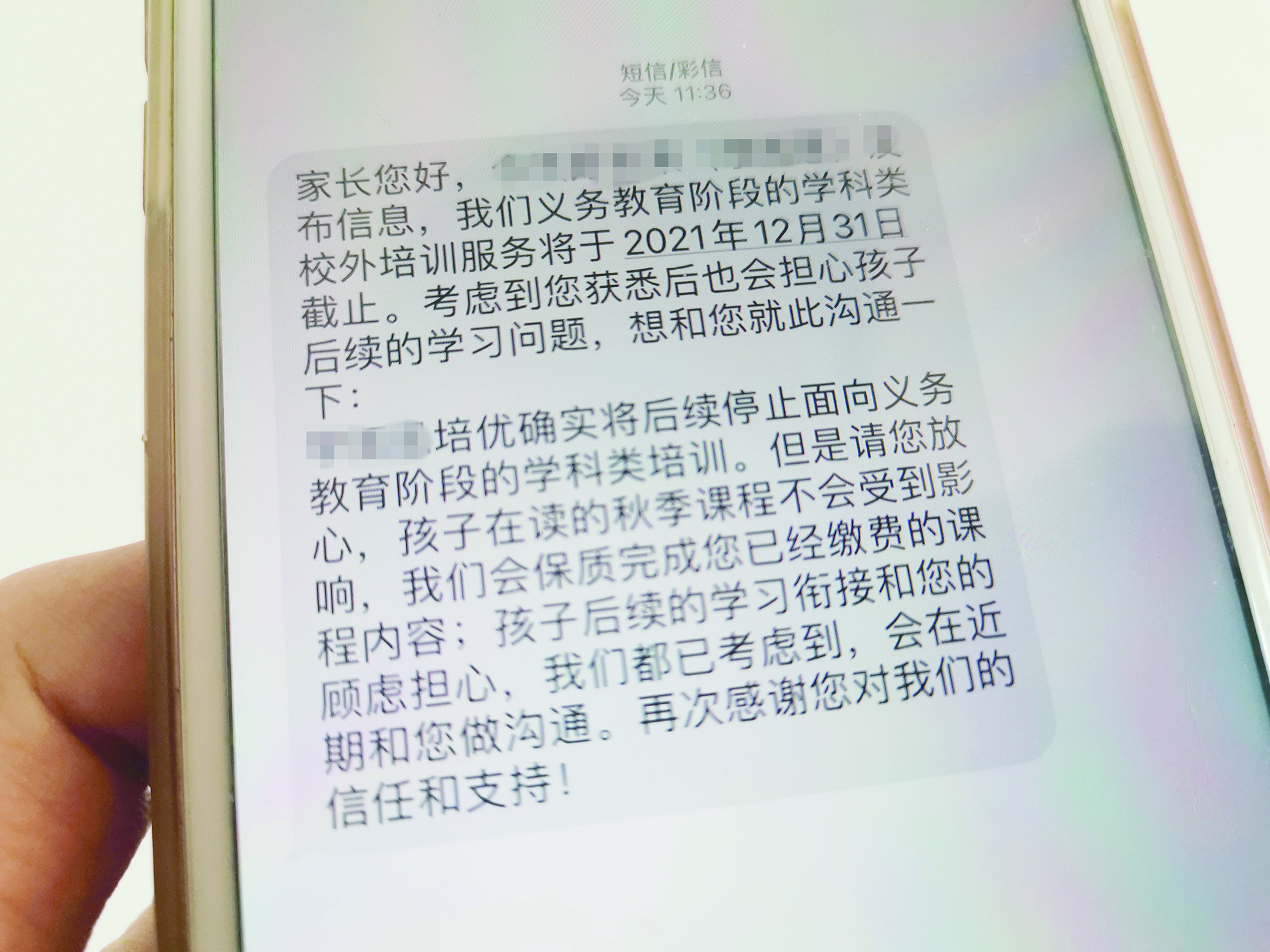 采访中,家长周女士向记者展示了一家培训机构发来的短信。文中称:根据国家相关规定,该机构义务教育阶段的学科类校外培训服务将于2021年12月31日截止。但孩子在读的秋季课程不会受到影响,相关业务将由国家批准成立的非营利机构来有序承接,课程可能以线上的形式开展。机构会保质完成已经缴费的课程内容。