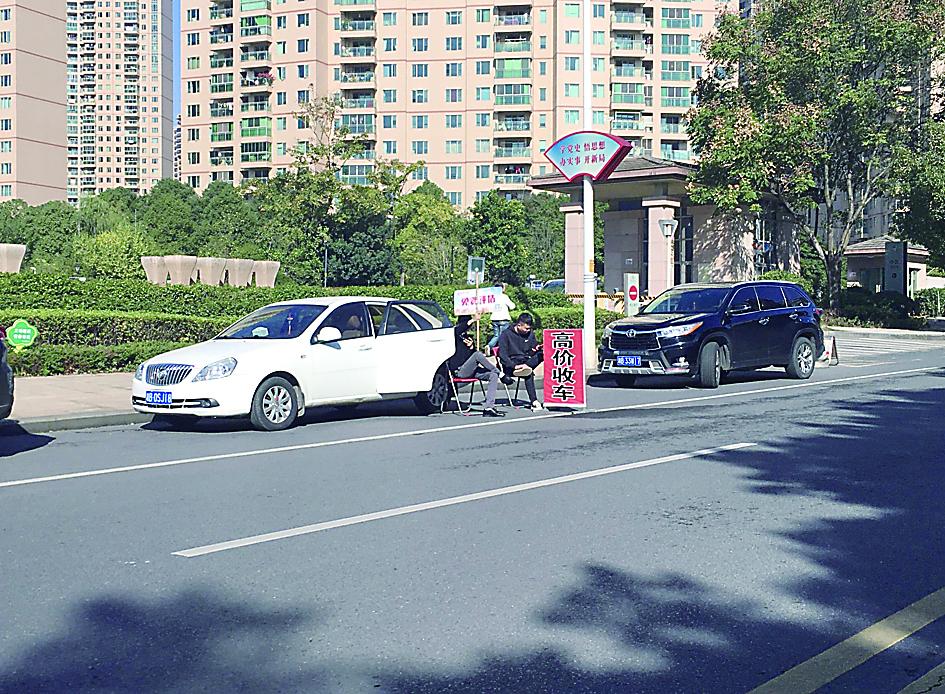 ▲收车人将车辆停在马路上,车旁摆着“收车”广告牌。 记者/刘平 摄