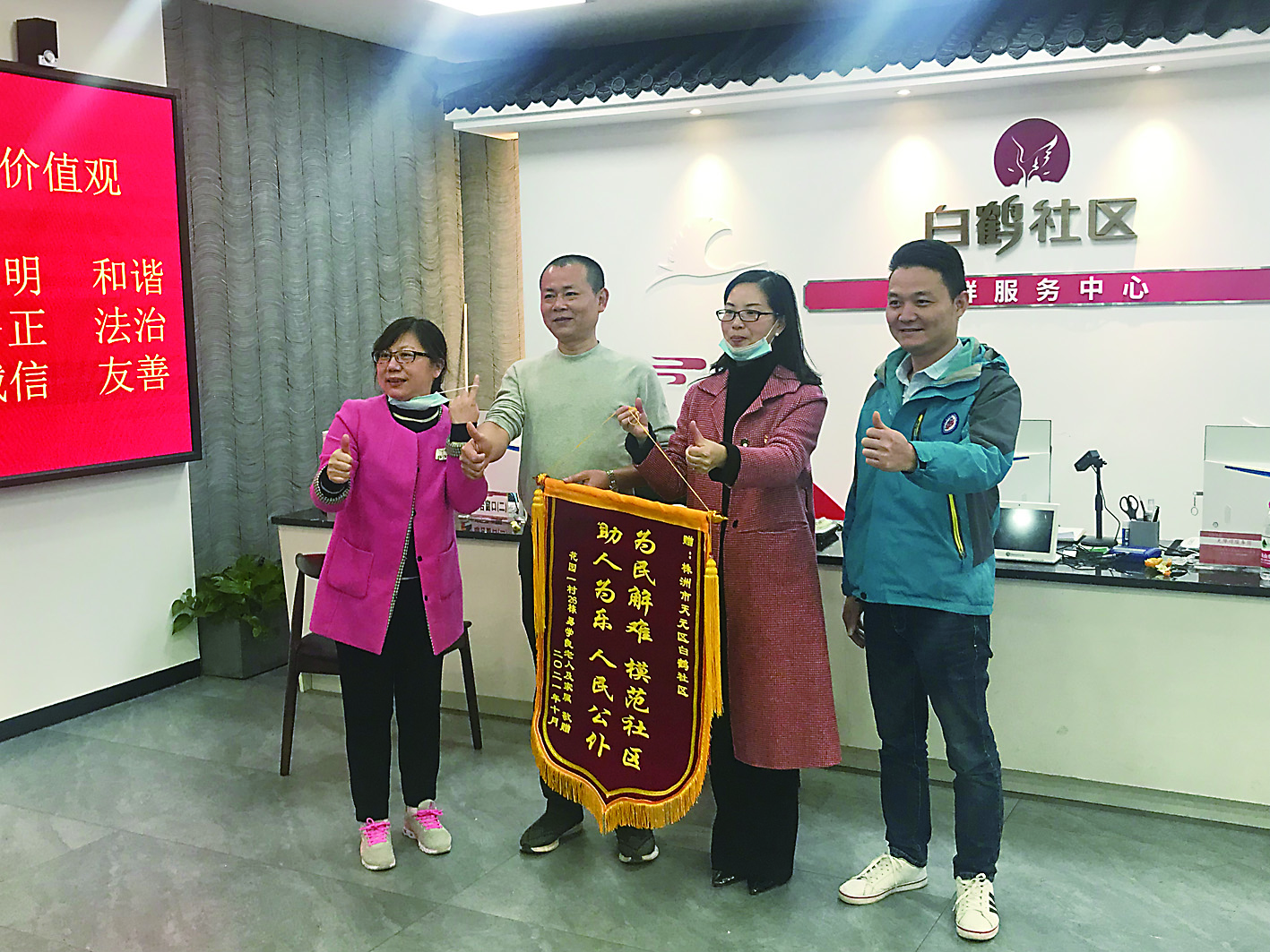 ▲胡女士(左一)送来锦旗,感谢罗鹏(右一)对老人的照顾。记者/谭昕吾 摄