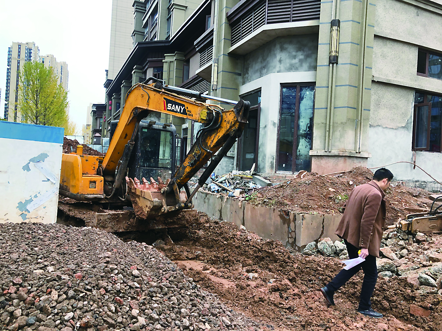 恒大悦珑台现场,几台挖机正在进行管线填埋及道路清理作业,小区园林和部分楼栋主体单位建设正常施工。一期项目工程部负责人介绍,从上周开始就有50多人进场施工,下周将陆续恢复到上百人的规模。当前,部分楼栋后续的室内装修、消防设施和小区智能化安装等工作正在同步进行。