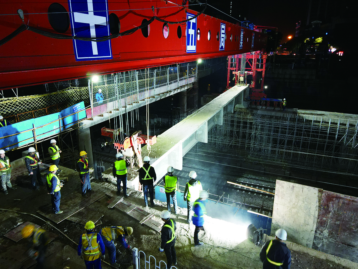 ▲新华桥东侧最后一片T梁吊离施工现场。通讯员/唐文健 摄