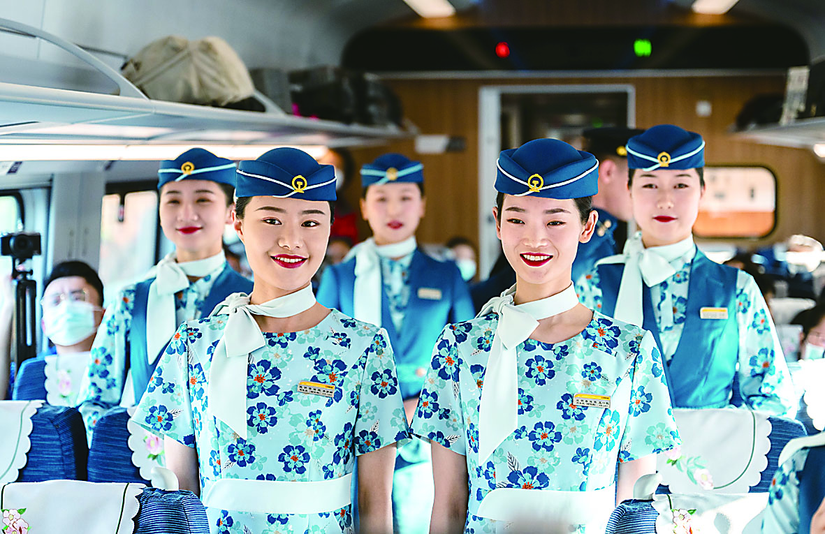 11月26日上午,中国铁路昆明局集团有限公司昆明客运段为即将开行的中老铁路而设计的列车员制服“丝路花语”首次亮相。据介绍,本次发布的列车员制服以“丝路花语”为主题,以“孔雀蓝”为主色调,搭配牡丹花、山茶花等元素。中老铁路全长1000多公里,北起云南省昆明市,南至老挝首都万象。 图为当日列车员在中老铁路媒体试乘体验列车上展示制服。