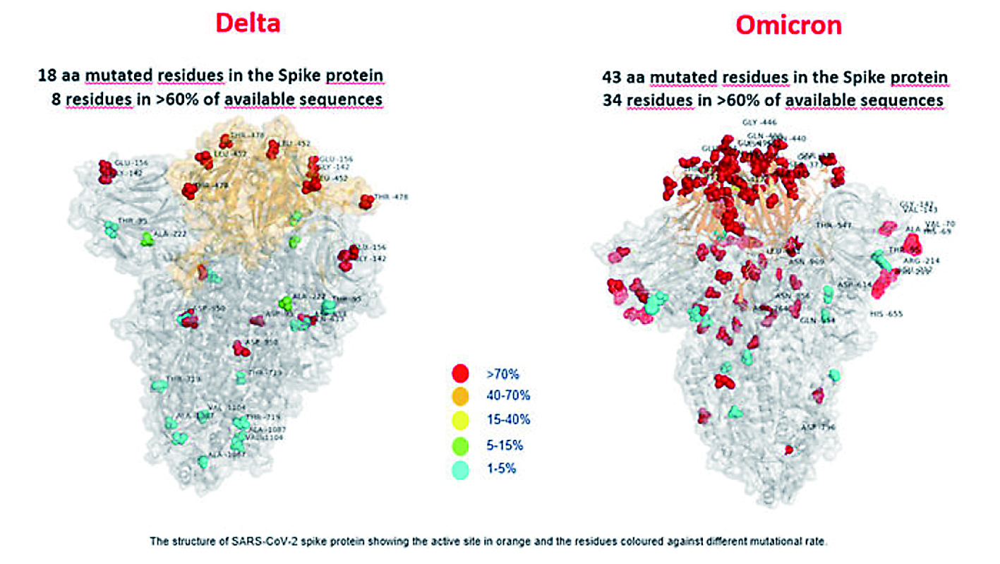 ▲德尔塔毒株与奥密克戎毒株刺突蛋白突变对比图。 图片来自罗马儿童医院
