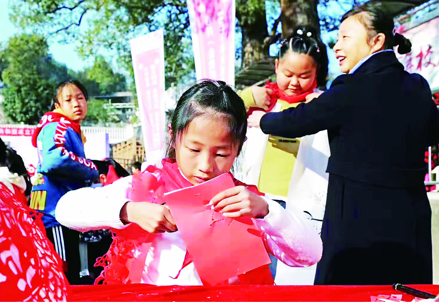 日前,第三批全国中小学中华优秀传统文化传承学校公示名单出炉,芦淞区金轮侨心学校榜上有名。其剪纸传统文化,纳入第三批全国中小学中华优秀传统文化传承项目。1993年,市非物质文化遗产传承人周建红老师将这门“剪刀功夫”带入金轮侨心学校(原百井学校),开设剪纸课程,担任剪纸社团指导老师。图为周建红(右一)在指导学生创作。