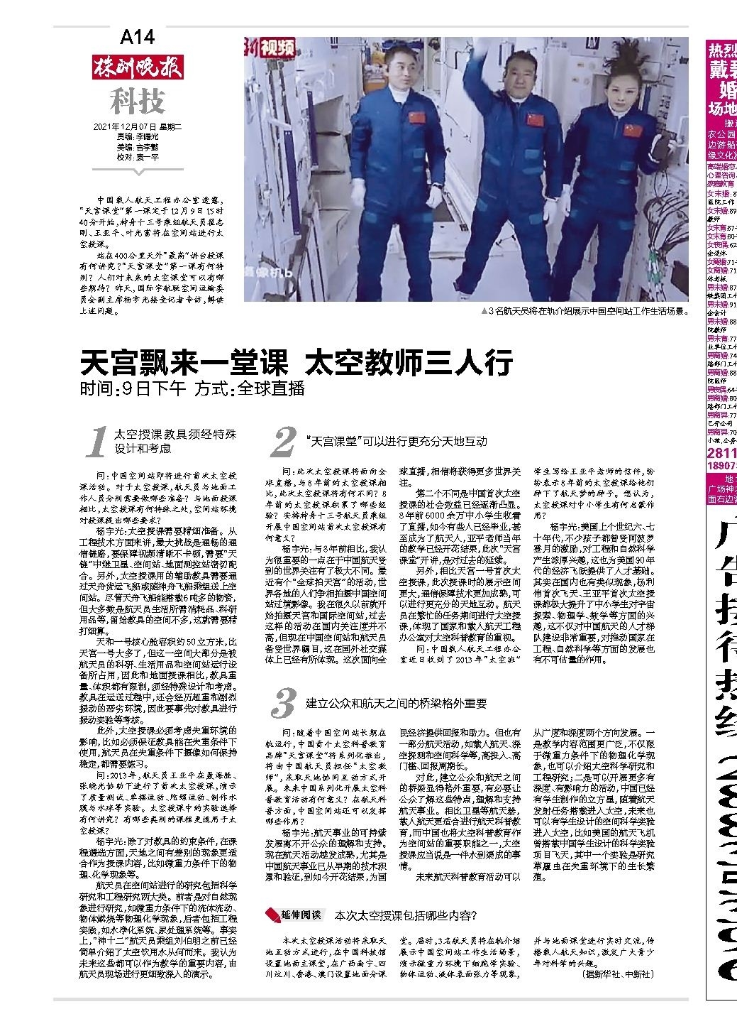 天宫飘来一堂课 太空教师三人行