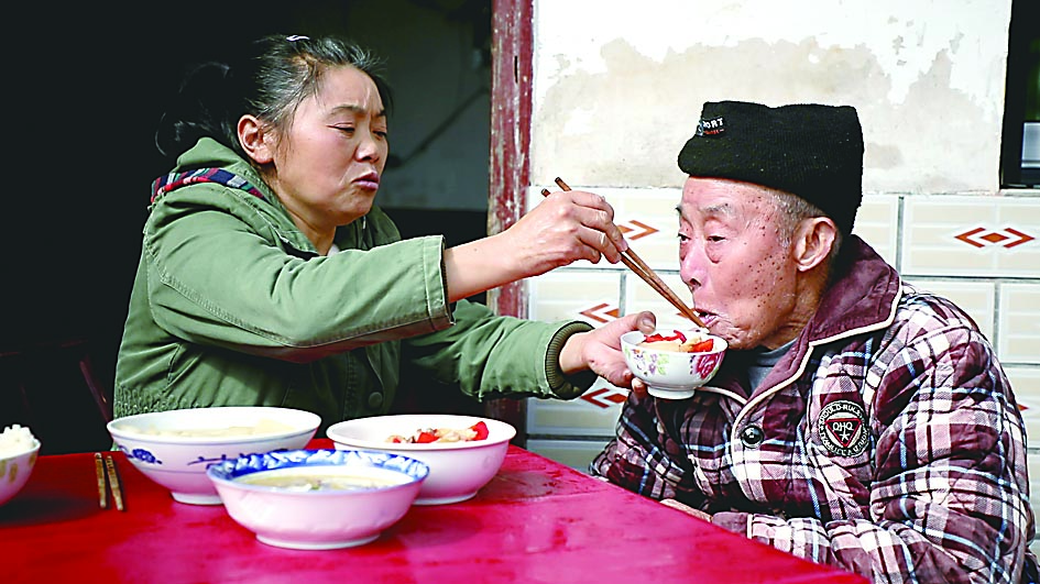 ▲颜冬英给公公喂饭。 通讯员/肖竞 摄