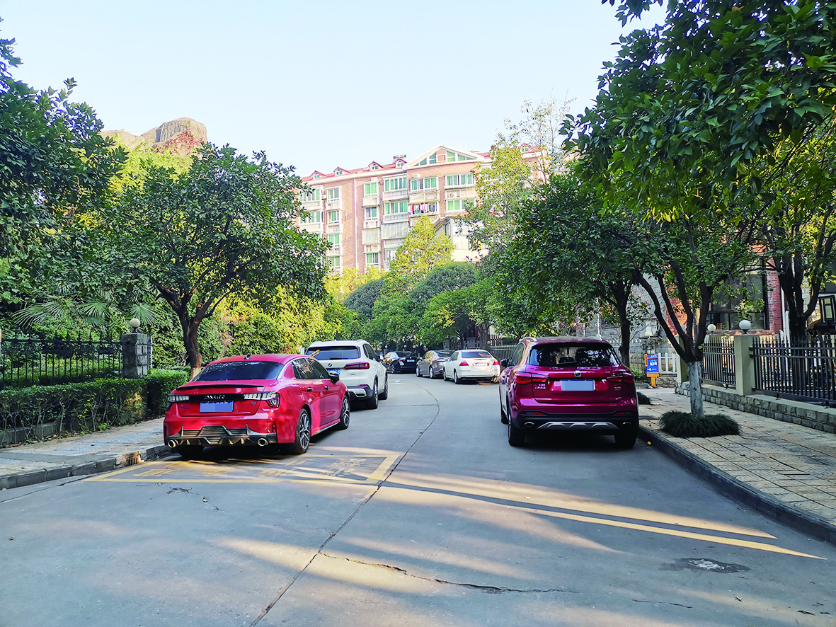 ▲湘银小区内,消防通道两侧有违停车辆。 记者/姚时美 摄