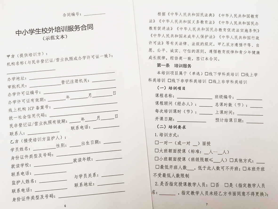 在今年培训机构转型和整治工作中,规范培训合同也是其中的重点。记者日前从市教育局等部门了解到,当前培训机构和家长使用示范合同文本意识仍然不强,近期,多部门将联合进行检查,机构如仍未使用示范合同文本将视为违规。