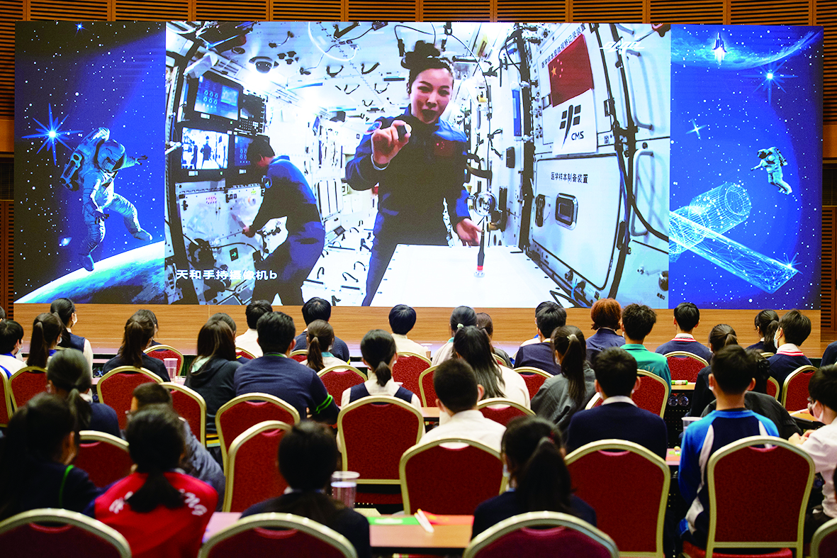 在约60分钟的授课中,神舟十三号飞行乘组航天员翟志刚、王亚平、叶光富生动介绍展示了空间站工作生活场景,演示了微重力环境下细胞学实验、人体运动、液体表面张力等神奇现象,并讲解了实验背后的科学原理。