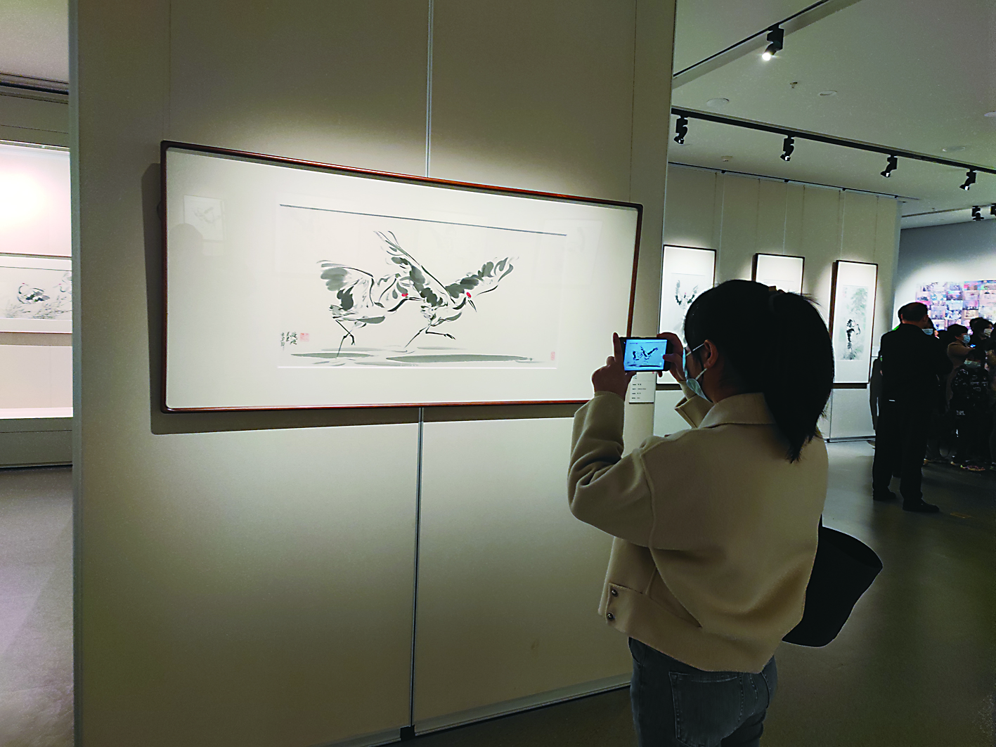 ▲画展现场,市民欣赏鲁晓波的鹤系列国画。记者/温琳 摄