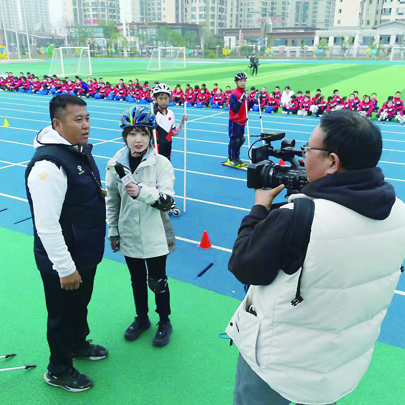 ◀央视探访市二中附小轮滑运动的开展情况。 记者/王晖 供图