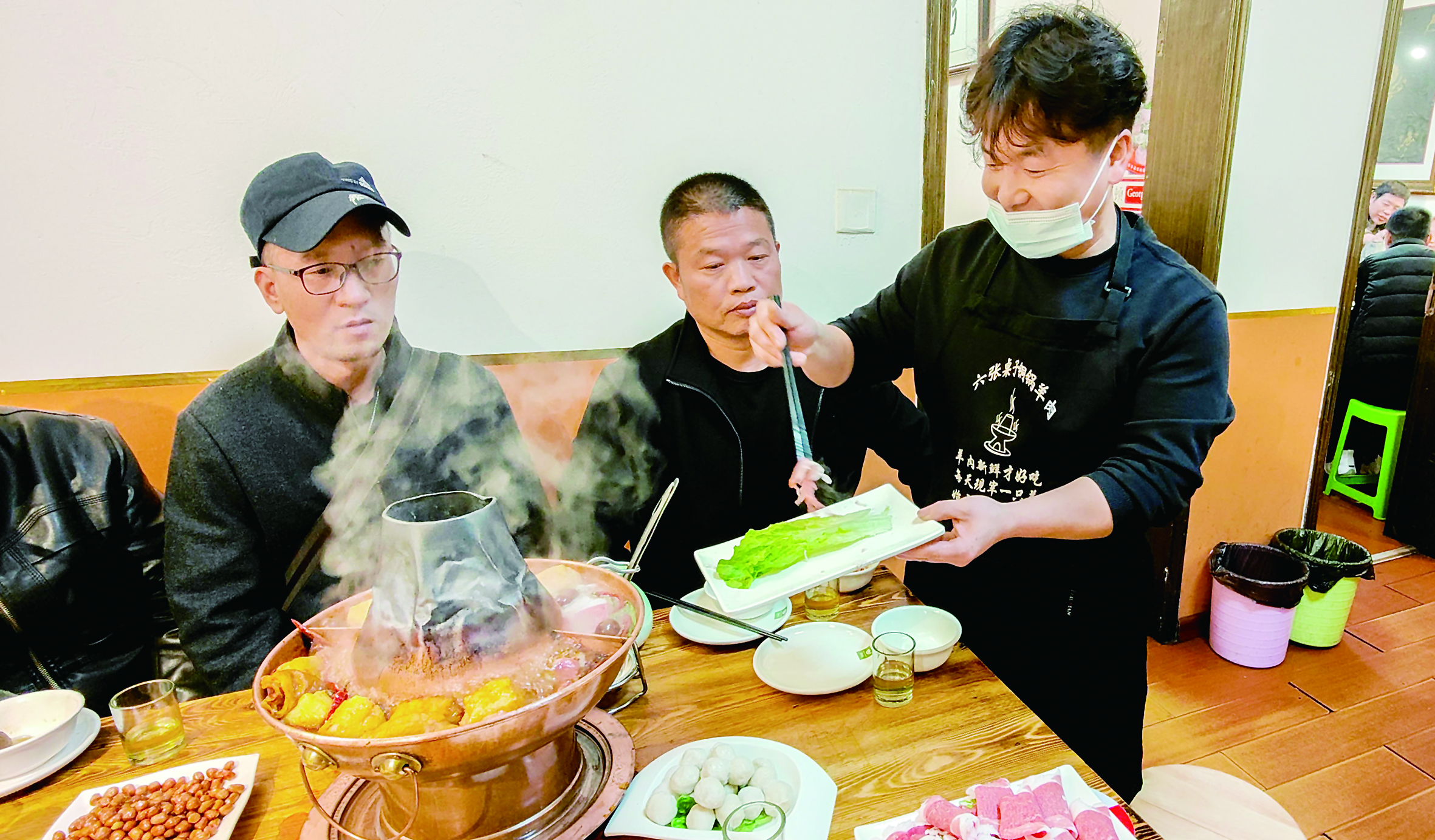▲吴兆杰为食客涮羊肉。记者/马文章 摄