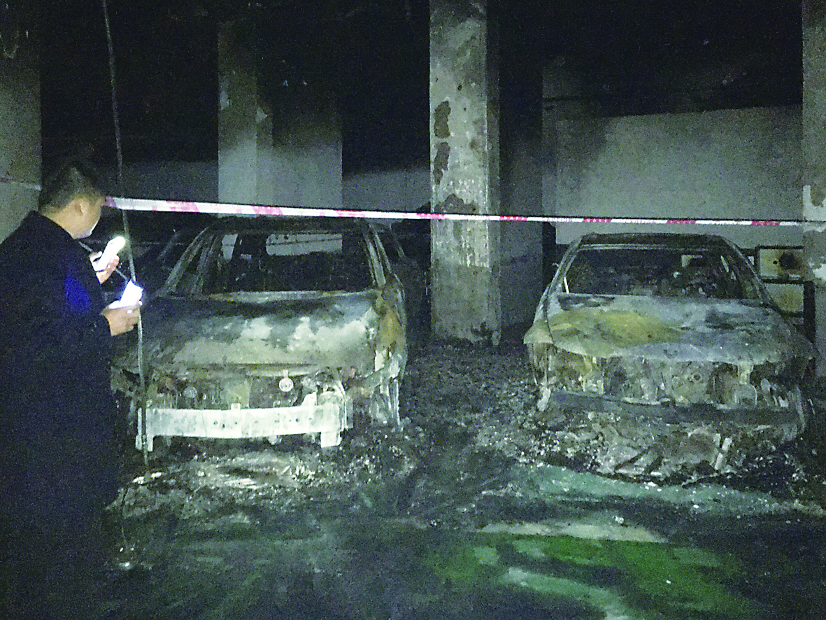 现场打扫卫生的保洁人员称,在16日凌晨2点多,小区保安在车库发现火情,马上施救,并拨打了119报警,有消防员赶到现场灭火。