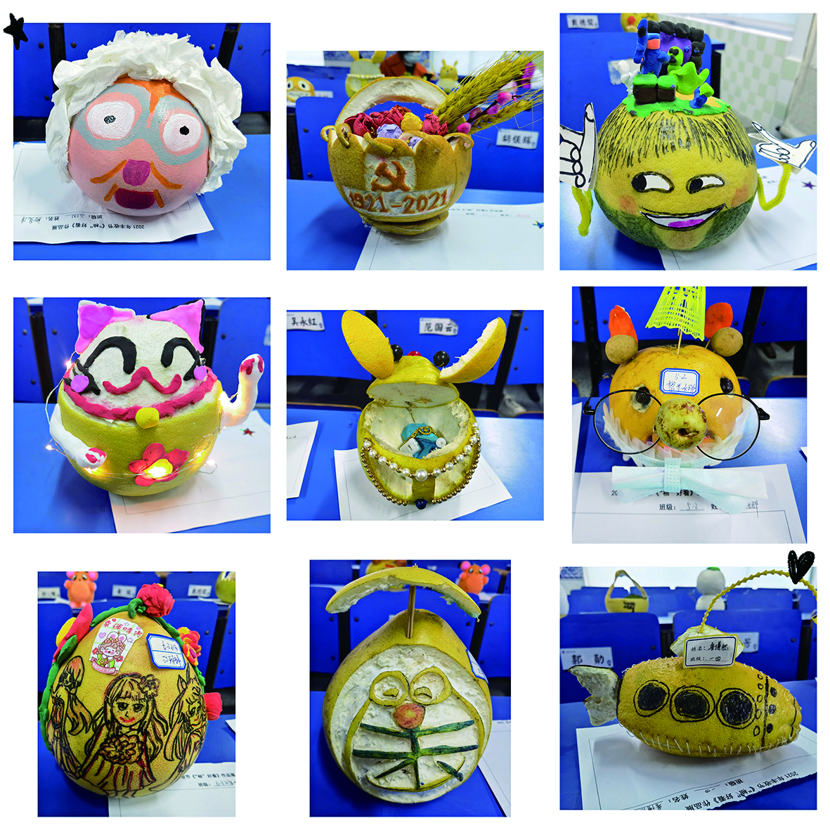 每年的柚子节我们都会以“柚子”为主题,来一场动手能力大比拼,同学们会纷纷呈上自己的柚子作品:有的把它们做成一盏盏可以照明的“灯笼”,有的则把它们设计成一份份不一样的“果盘”,还有的同学会在柚子上画上自己喜爱的图画……这些作品可真是千姿百态、别出心裁!
