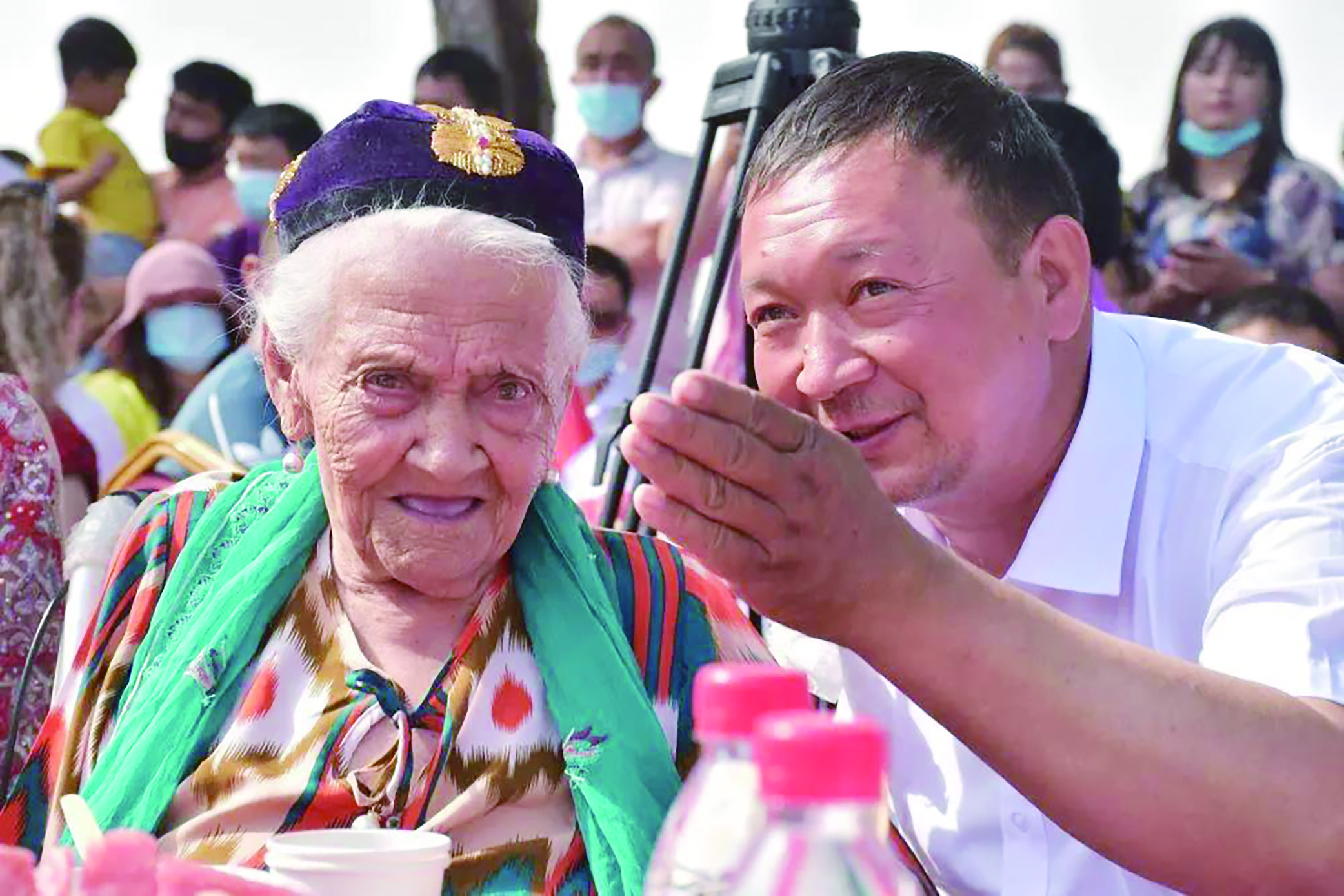 ▲2020年6月25日,阿丽米罕·色依提(左)在新疆疏勒县庆祝134岁生日现场与孙子交谈。(网络供图)