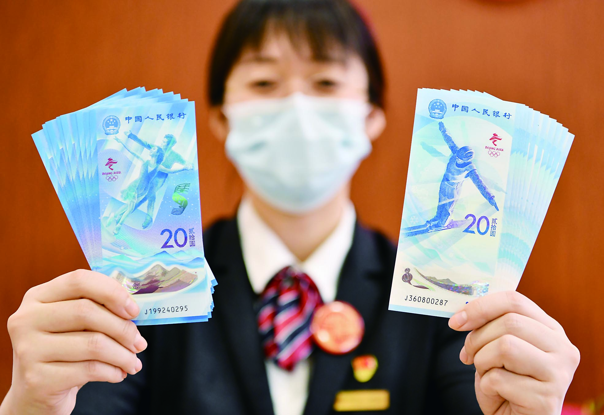中国人民银行定于2021年12月21日发行第24届冬季奥林匹克运动会纪念钞一套,包括冰上运动项目纪念钞和雪上运动项目纪念钞各1张,纪念钞每张面额均为20元。冰上运动项目纪念钞为塑料钞,雪上运动项目纪念钞为纸钞。纪念钞发行数量为2亿套,采取预约兑换方式发行,纪念钞与现行流通人民币职能相同,与同面额人民币等值流通。图为12月21日,中国工商银行北京西客站支行的工作人员展示纪念钞。 新华社记者/李鑫 摄