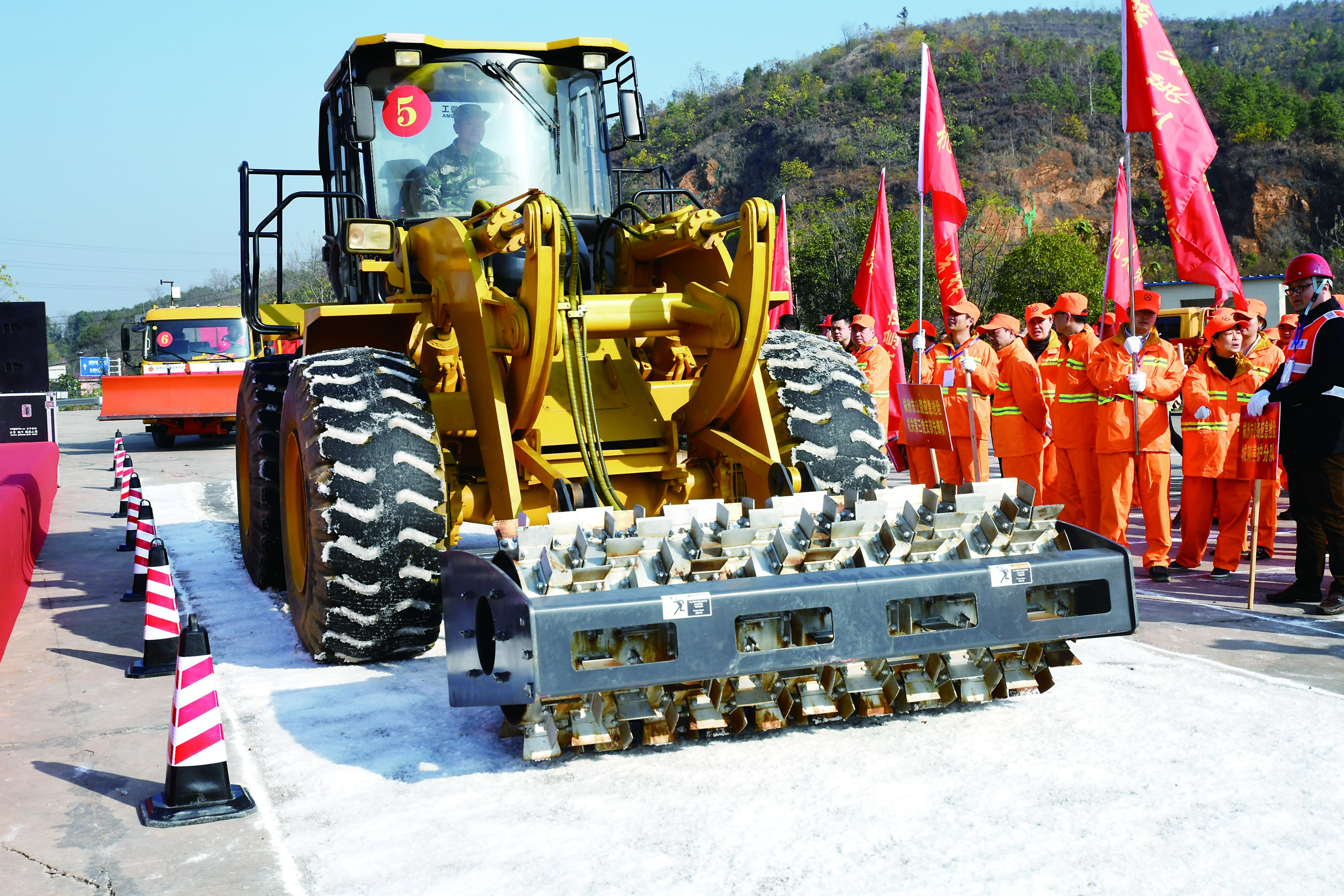 ▲由破冰车、铲雪车、撒盐机、养护车、桥梁检测车组成的梯队开始工作。通讯员供图