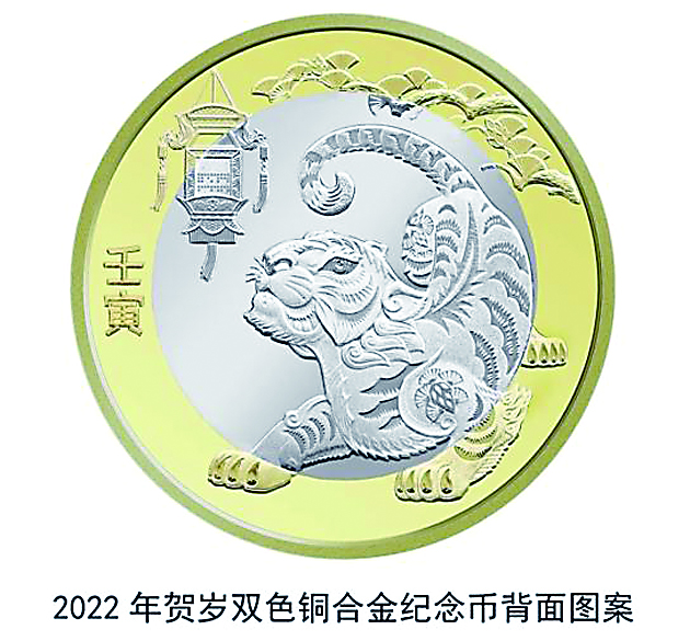 双色铜合金纪念币正面图案为“中国人民银行”“10元”字样,汉语拼音字母“SHIYUAN”及年号“2022”,底纹衬以团花图案。背面主景图案为中国传统剪纸艺术与装饰年画元素相结合的老虎形象,衬景图案为花灯和松枝、松果,币面左侧刊“壬寅”字样。