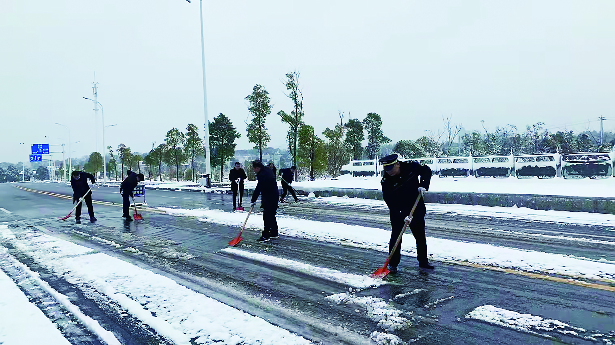 ▲昨日,我市交警、城管等相关职能部门工作人员,以及部分社区党员干部、志愿者,积极上路扫雪除冰,确保道路和桥梁畅通安全。图为天元区马家河街道城管人员正在路上清除积雪。株洲晚报融媒体记者/何春林 摄