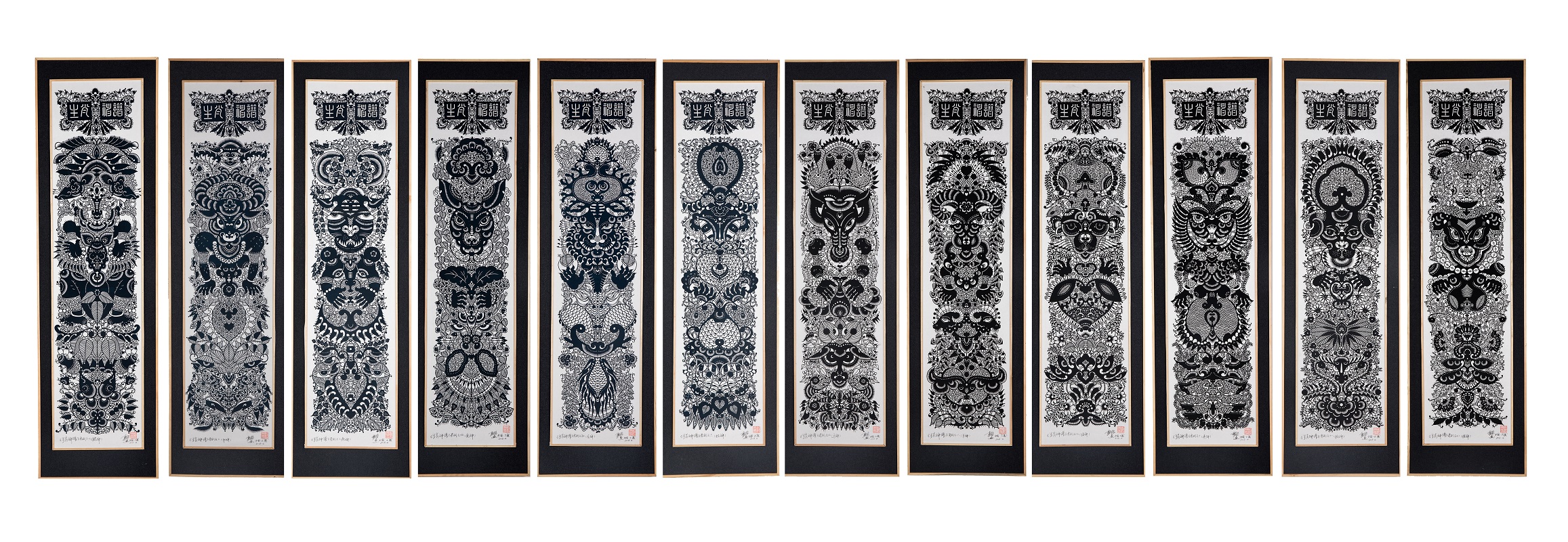 刘延山自幼酷爱民间传统艺术,拜中国工艺美术大师傅作仁为师,并得到了剪纸艺术大家的指导。从艺50年来勤“剪”不怠,终于自成一家。《生肖神谱》以十二生肖为主题,在立意与内涵中充分展现萨满教义神韵的意境,把北方萨满民俗剪纸创作理念和传统技法淋漓尽致地表现了出来。作品以黑重颜色纸剪刻,线条繁复细腻,创作构思巧妙。构图对称,手法诡异,形象狰狞,衬托出幽深、灵异、神秘、肃穆的宗教氛围,刻意将诸神形象加以推崇和强化,营造极具规模的视觉美感,活灵活现的萨满文化传奇几乎触手可得,给人以无尽的艺术享受。娴熟的技法、尚古的创作理念和求新的时代底色清晰可见,尽显萨满民俗剪纸艺术的魅力和希望可期的发展前景。