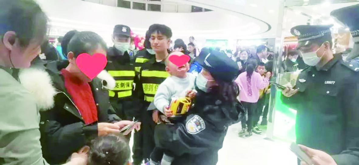 当晚8时,学林派出所8名民辅警在万达广场巡逻时,发现一名约3岁的小男孩走失,因找不到爸妈正哇哇大哭。