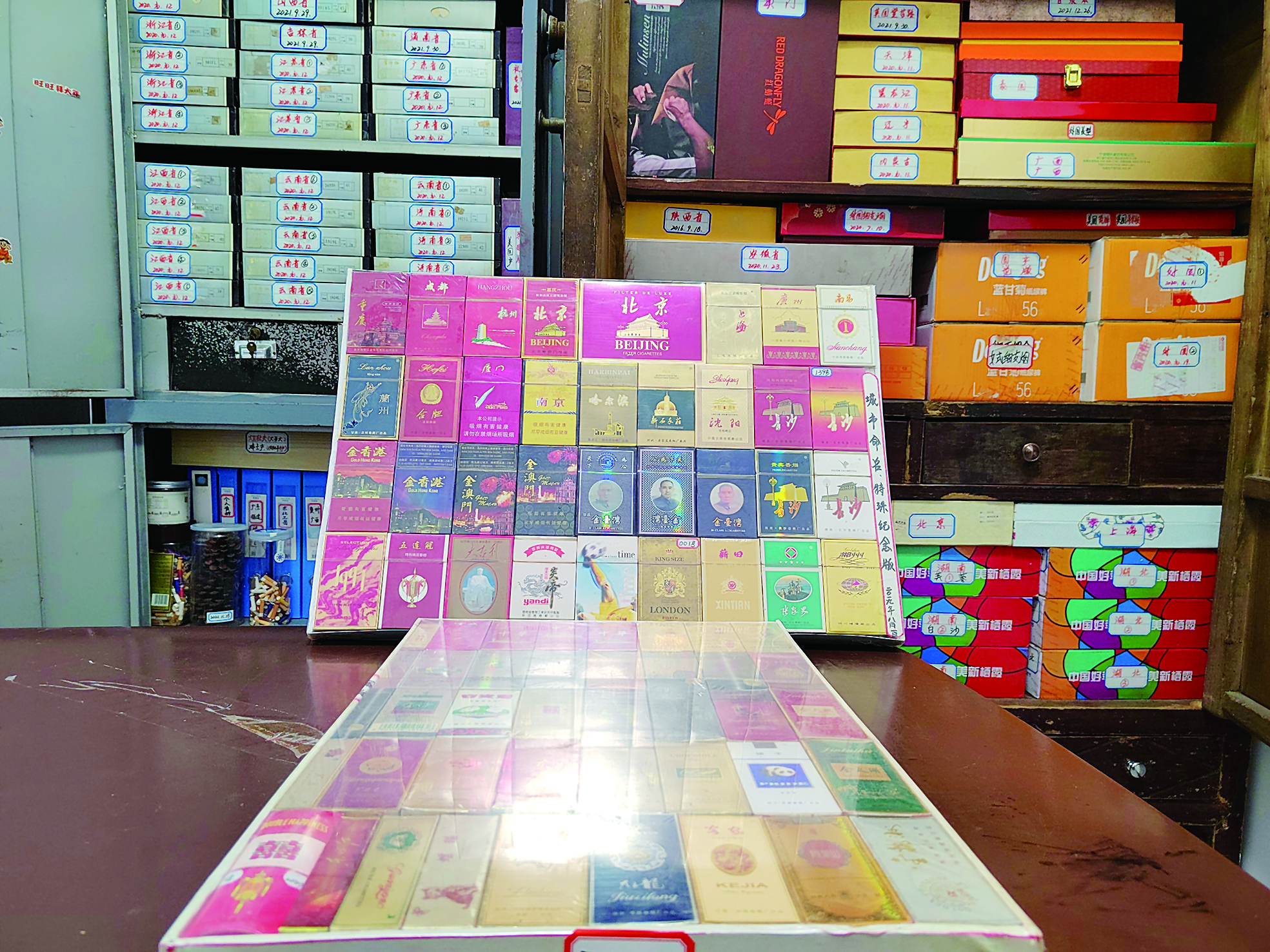 ▲陈志军收藏的香烟盒(部分)。 记者/易楚曈 摄