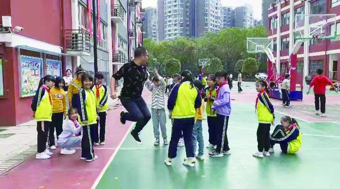 “马兰开花二十一,二八二五六,二八二五七……”距离下午上课还有15分钟,荷塘区天鹅湖学校的操场上,一位中年男子一边跳着皮筋,口里一边喊着口诀。他并不是在参加学校教职工运动会,也不是准备什么比赛,而是真真切切地与孩子们一块玩耍。